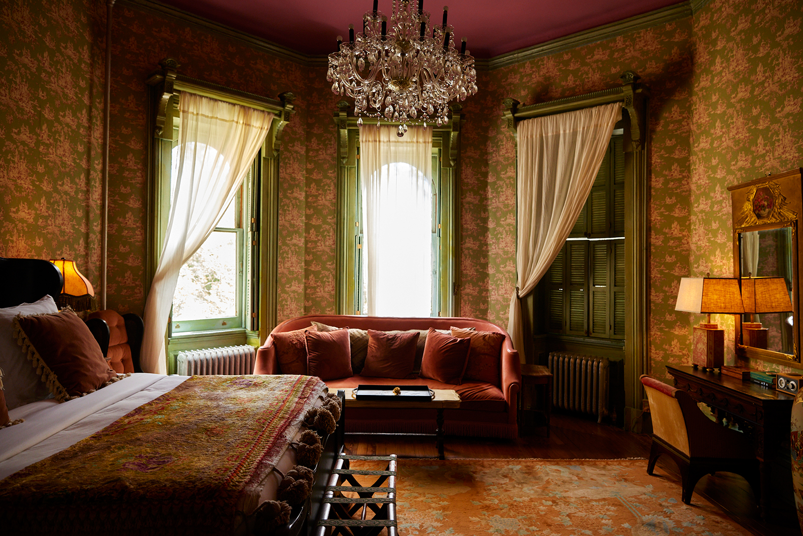 The crisp white exterior of this Italianate estate gives way to a lobby dipped in jewel tones and chockablock with antique fixtures. You won’t be able to miss any of the maximalism—in fact, hotelier Jayson Seidman worked with a team of film lighting specialists to spotlight it all, including the original mahogany staircase that meets a domed stained-glass skylight before ushering you to the guest suites. (Major Titanic vibes.) On the second and third floors, rooms feel residential—that is, if you’re a 19th-century debutante—with touches of modern comforts, like Aesop toiletries and Parachute linens, which still look at home with the vintage furnishings (some of which were found in the old house’s attic) and toile wallpaper. $$$