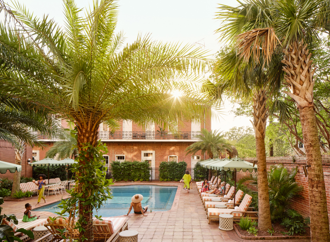 The story of Hotel St. Vincent begins with Margaret Haughery, an Irish orphan who founded an “infant asylum” here in 1835, and meanders through religious, philanthropic, and European narratives before reaching its current chapter—which might explain why many of the 75 rooms overlook a 150-year-old Virgin Mary grotto. Inside, a psychedelic pattern shows up in the rooms, on lampshades, and on robes; it was inspired by the marbled bindings found on Haughery’s financial ledgers. Oversize rattan pendant lamps and mosaic floor tile in the Paradise Lounge feel reminiscent of the Amalfi Coast—a nod to NOLA’s lesser-known Italian influences. And sure, the history is fascinating, but nothing beats a day at the pool lazing on striped loungers with a Creole colada in hand. $$$
