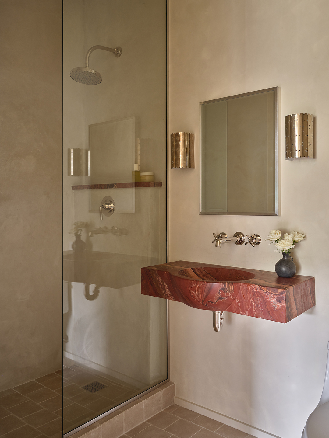 We’ve heard of pink onyx and even green onyx before. Little did we know the stone came in this rich shade of red. Kayne notes they pulled the color for the bathroom sink—and matching shower shelf!—from the Dume linen sofa in the living room.