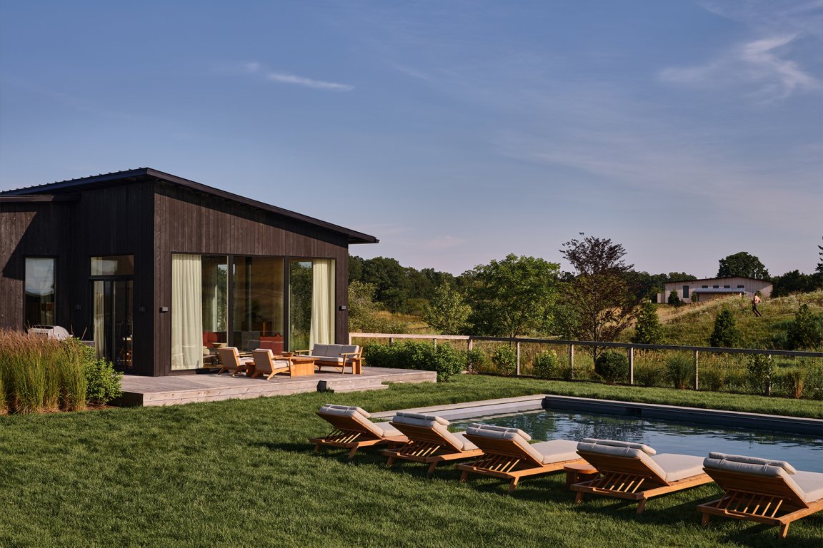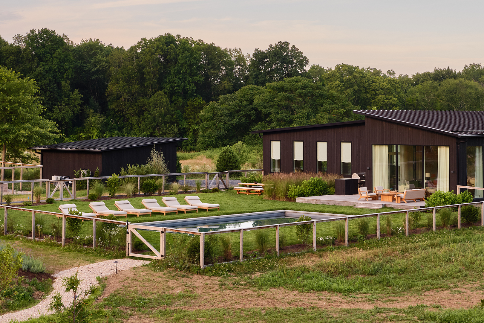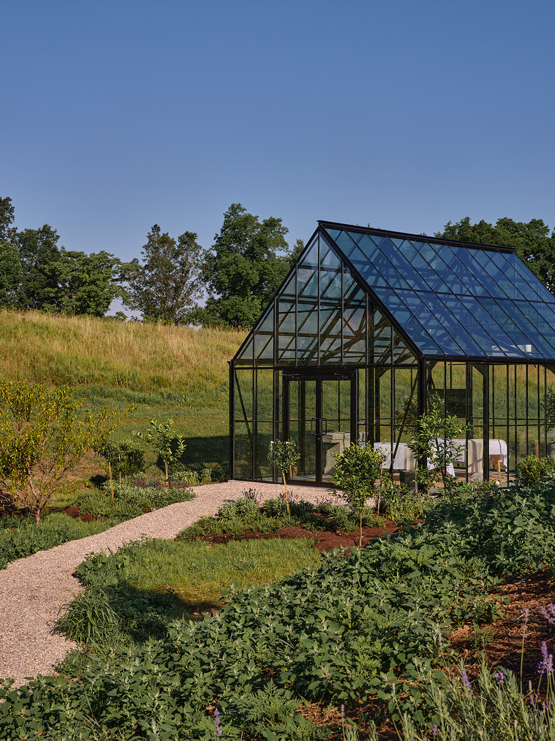 Kayne worked with Gothic Arch Greenhouses to design a custom treatment room for the Oak Wellness Club. “In design books, I’ve seen these stunning guest rooms or tucked-away moments in a greenhouse, and this felt like the perfect touch—to create a self-care haven nestled in nature,” she says. Situated at the end of a meandering gravel path, the lone structure could theoretically function as a dining room, gym, or office in your own backyard.
