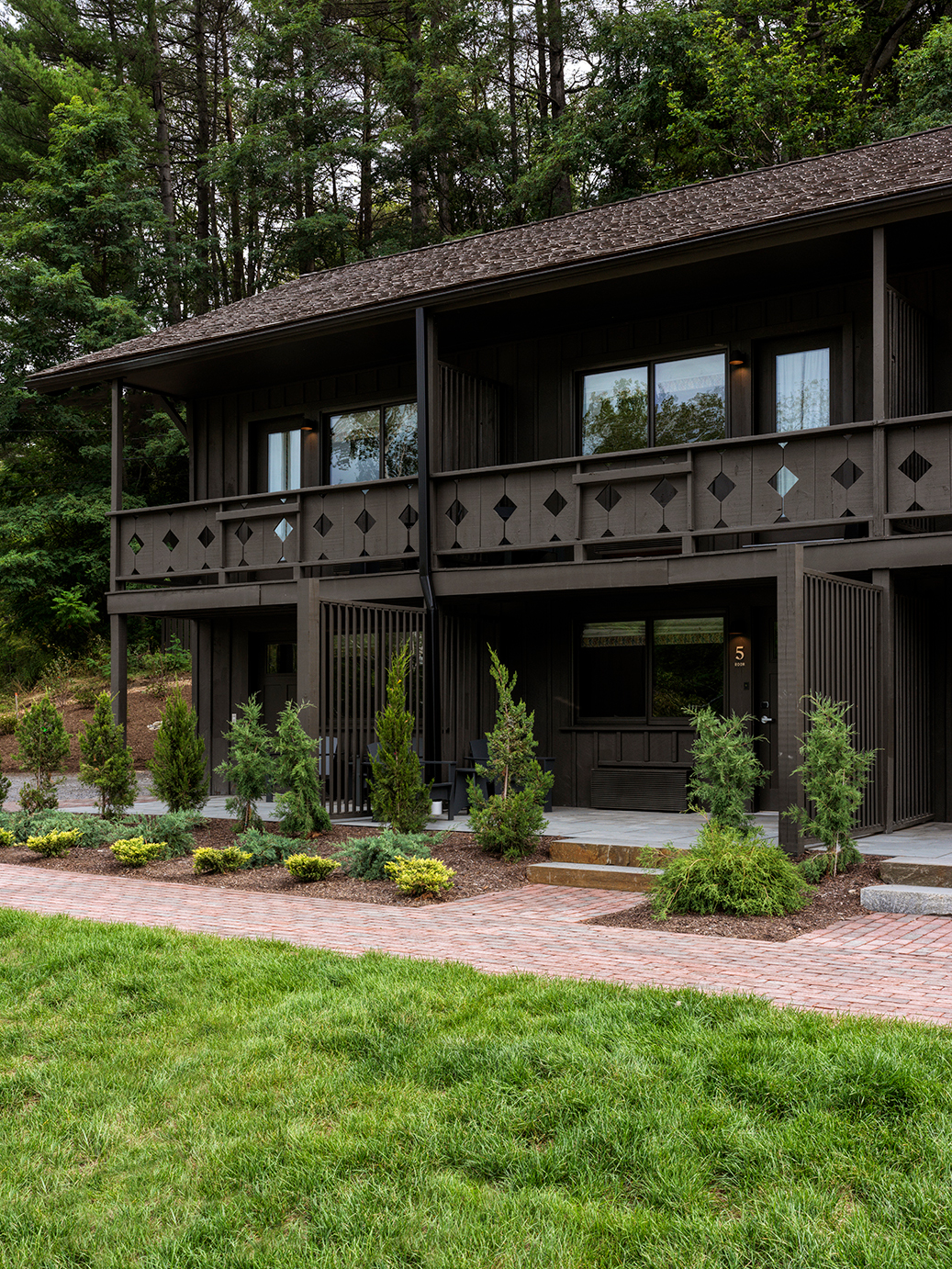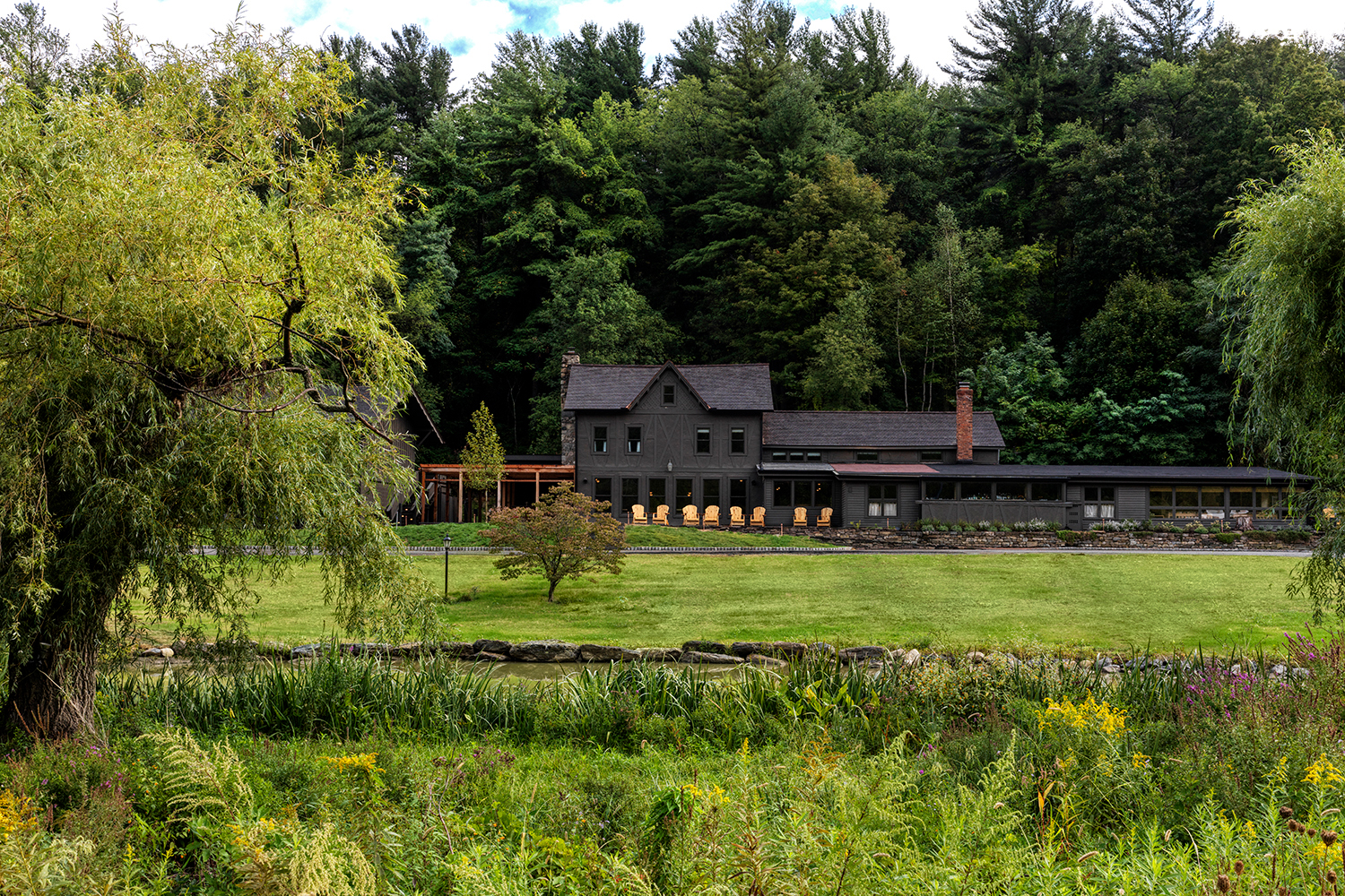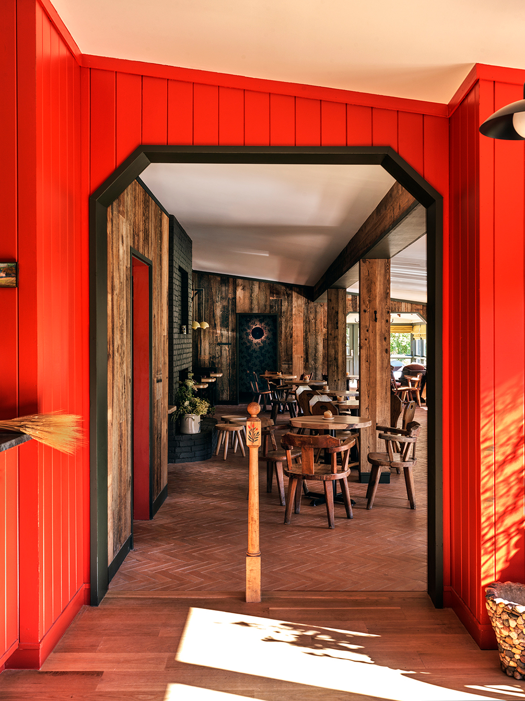 Lots of natural materials can sometimes result in stuffiness. Juxtaposing them with vibrant, saturated shades can breathe new life into a space. Daye glazed an entire lounge room in tangy orange—a shade inspired by the fall foliage often seen in the neighboring Berkshires—for a respite from the woodsiness. “It felt fitting,” she says. “Maybe a tiny wink to locals.” It happens to play off the forest green trim nicely, but Daye notes that there’s not always a clear case for the right color pairings; sometimes you have to jump in and take the risk. “We feel quite fearless about big decisions like this paint color, but honestly it’s just an experiment that worked out,” she admits.