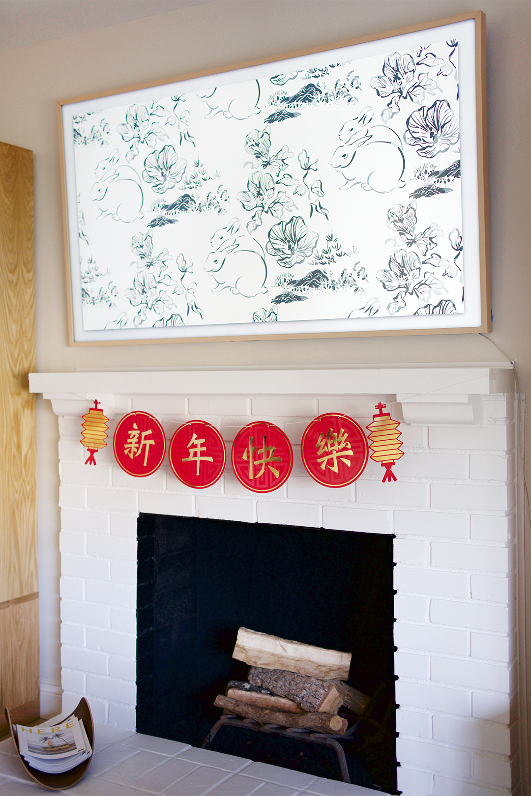 Another Target win were these 3-for-$2 wall decals. Although you’re supposed to peel off the back so that they can cling to surfaces, I wanted to be able to reuse them, so I just used double-sided poster tape. The firecracker and lantern garlands are by My Mind’s Eye Paper Goods, and I just love the golden foil touch. They look like modern iterations of the flashy decorations my dad would always adorn our home with during the holiday. And while I found these red knots (which also signify good luck and prosperity) at my local Asian plaza, you can easily DIY them. Finally, I discovered Year of the Rabbit art on Etsy so that even my Samsung Frame TV can get in on the fun.