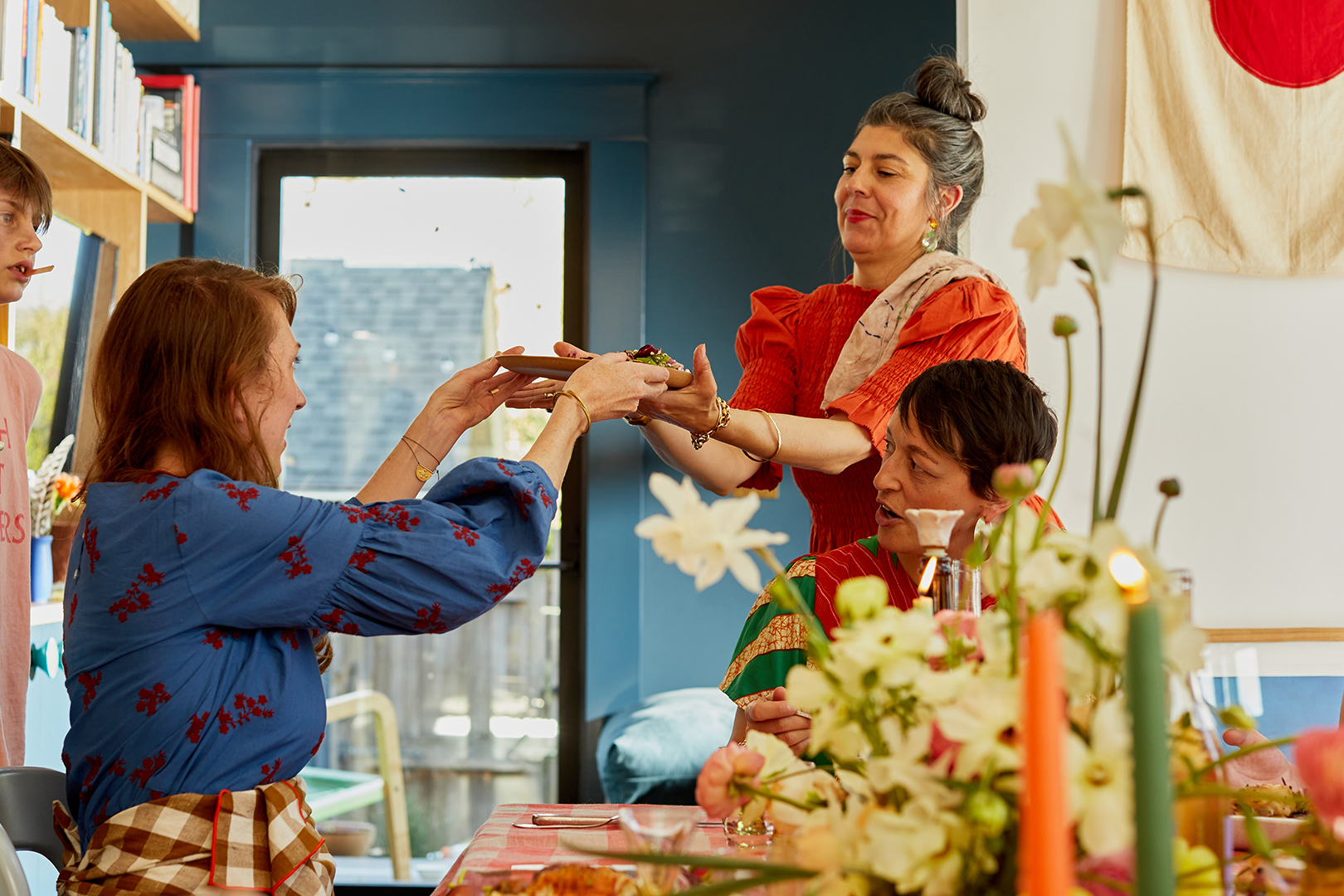 When you’re putting together a guest list, Carrillo and Kirk know that it helps to invite friends who can each play to their own strengths and contribute to the good times. “When mothers come together, they offer themselves up, like ‘Give me a job,’” Carrillo says. In this case, it also helps to have pals like sommelier Dana Frank, who owns local sipping spot Bar Norman and was put in charge of the vino; ceramist Martina Thornhill, who made the plates; Mahsa Darabi, who brought her Moody Chai; and Naz Sahin, who works on branding for Madre and designed the menu cards. And those blooms on the table? All courtesy of their bud Megan Arambul, who owns Fieldwork Flowers in town.