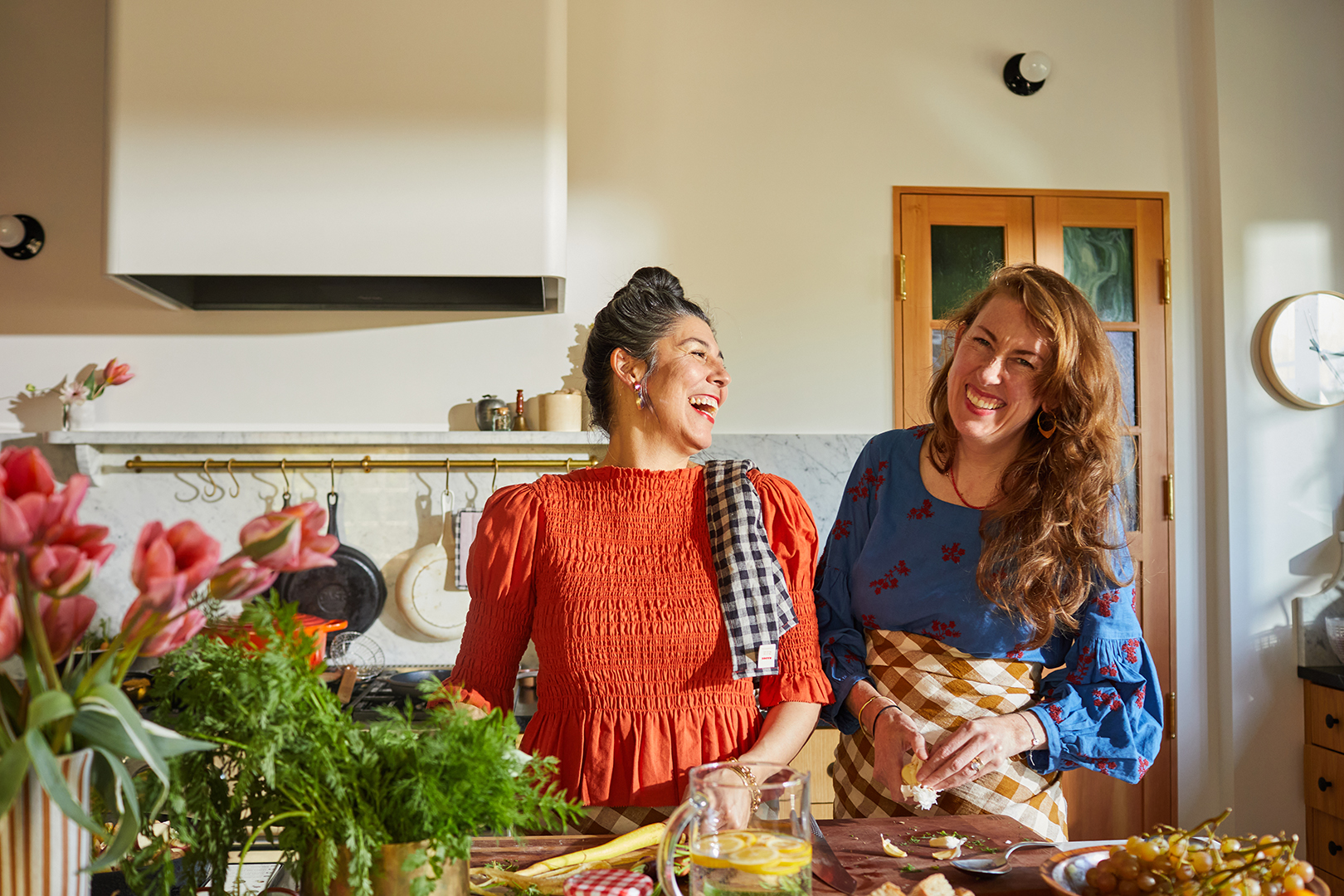 And they carry those good vibes over into their personal lives, too. “The way that Shay and I both really show our love is through cooking,” Kirk says. “So we wanted to make a meal together with people whom we share space with anyway.” This spring, the founders gathered their cool coven of friends to celebrate motherhood, the feminine economy, and, of course, their new line of madras linens—which debuts June 21—over dinner. Here’s how the whole thing came together.