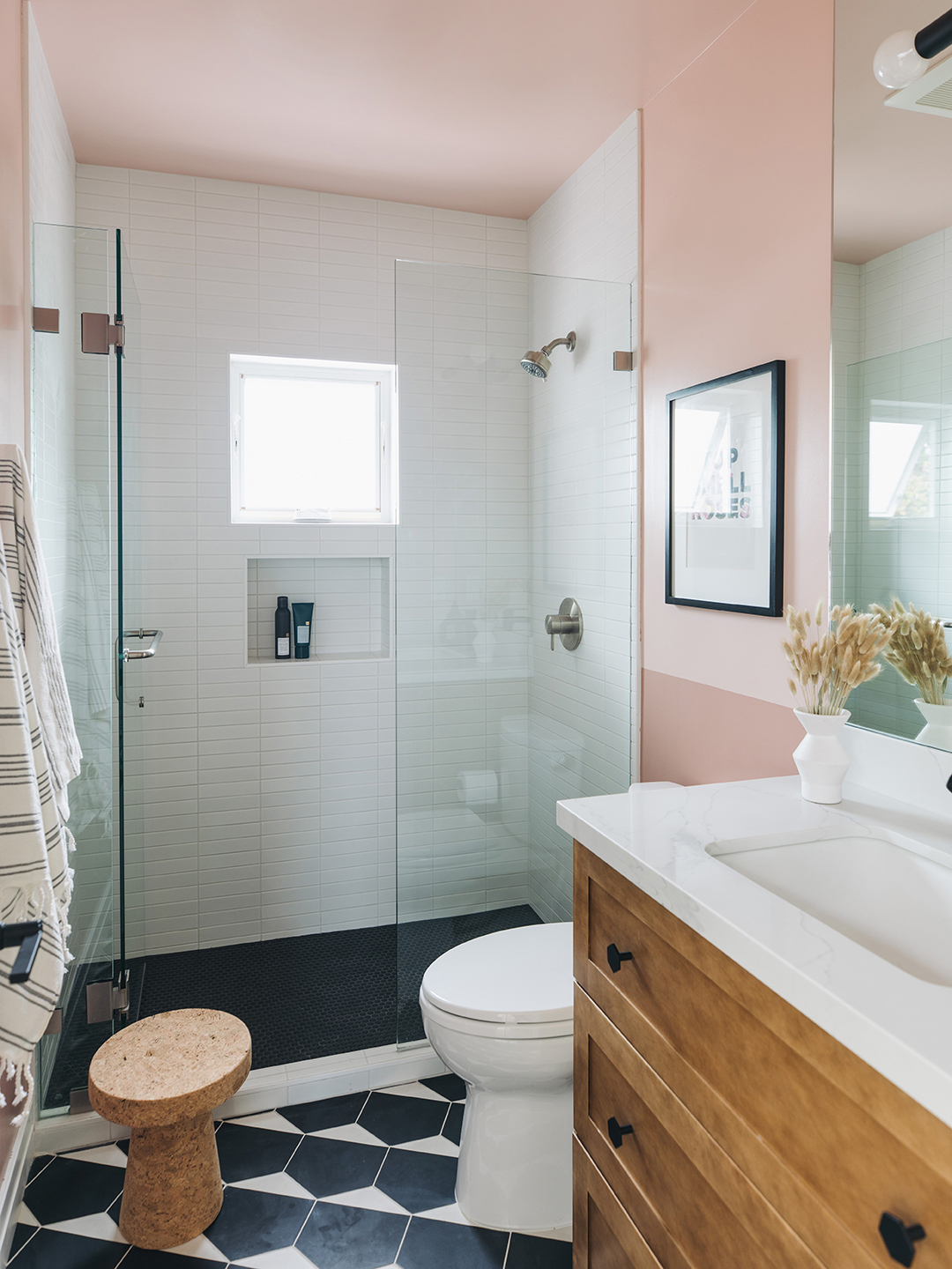When it came to decorating her client’s home for eight, the trickiest thing for Hong was trying to marry the homeowners’ and their parents’ aesthetics. “I tried to keep things a bit more traditional in the common spaces,” the designer says. Their long dining table, for example, blends a classic shape with unexpected details like slatted legs. Meanwhile in the kids’ bathroom, pastel pink paint (pictured above) and cloud-print wallpaper give the littlest members of the household a place that feels all theirs.