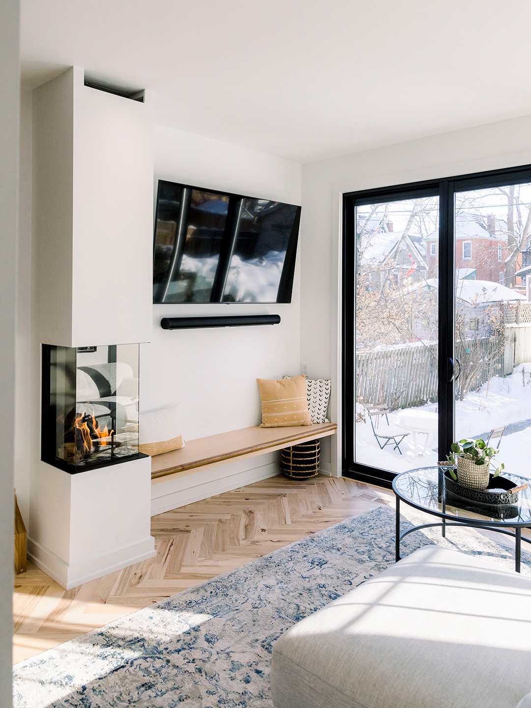 While her Hamilton, Canada, home is only 750 square feet, Stefanie Dollak was still able to squeeze in a fireplace by situating a teeny gas version from Barbas Bellfires off to the side of her TV, freeing up room for extra built-in seating below.