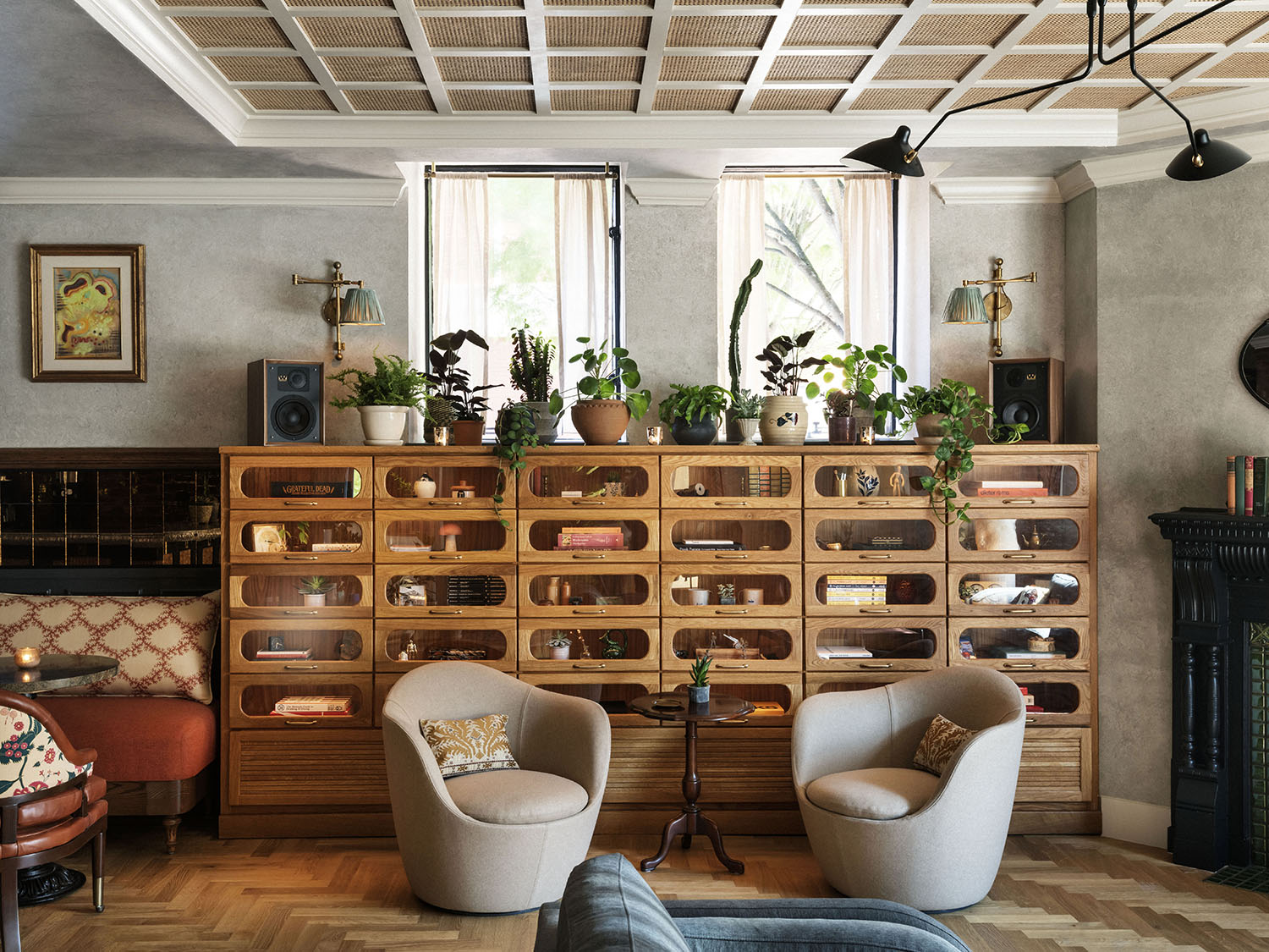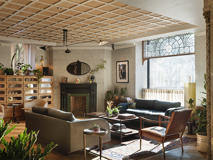 Mixing styles to counterbalance the Victorian architecture was no small feat, but Olsovsky and the team make it look seamless with a blend of Shaker-influenced furniture, traditional floral-print wallpapers from Farrow & Ball and Little Greene, and modern pieces from Gubi and Lawson-Fenning. Method Co.’s cofounder and CEO, Randall Cook, also sought out local craftspeople to fill the space with work that resonates with the destination. Joseph and Benjamin Johnson of Workerman Studios, a Philadelphia-based father-and-son team, created several of the property’s focal points, including the haberdashery-inspired cabinet in the lobby.