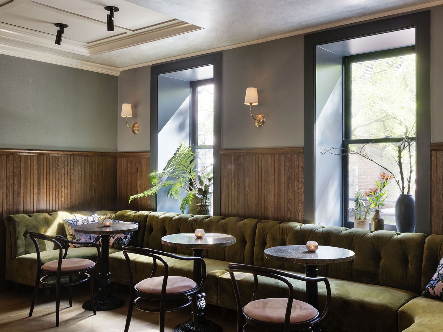 Throughout the common spaces, details help set the mood. Richard Stokes, founder and senior principal of Stokes Architecture + Design, says deciding on the proper lighting was essential to draw people into the environment. “It needs to be warm,” he says (2,400k, to be exact). “And not just to light the space, but the tables and the faces of guests when seated.”