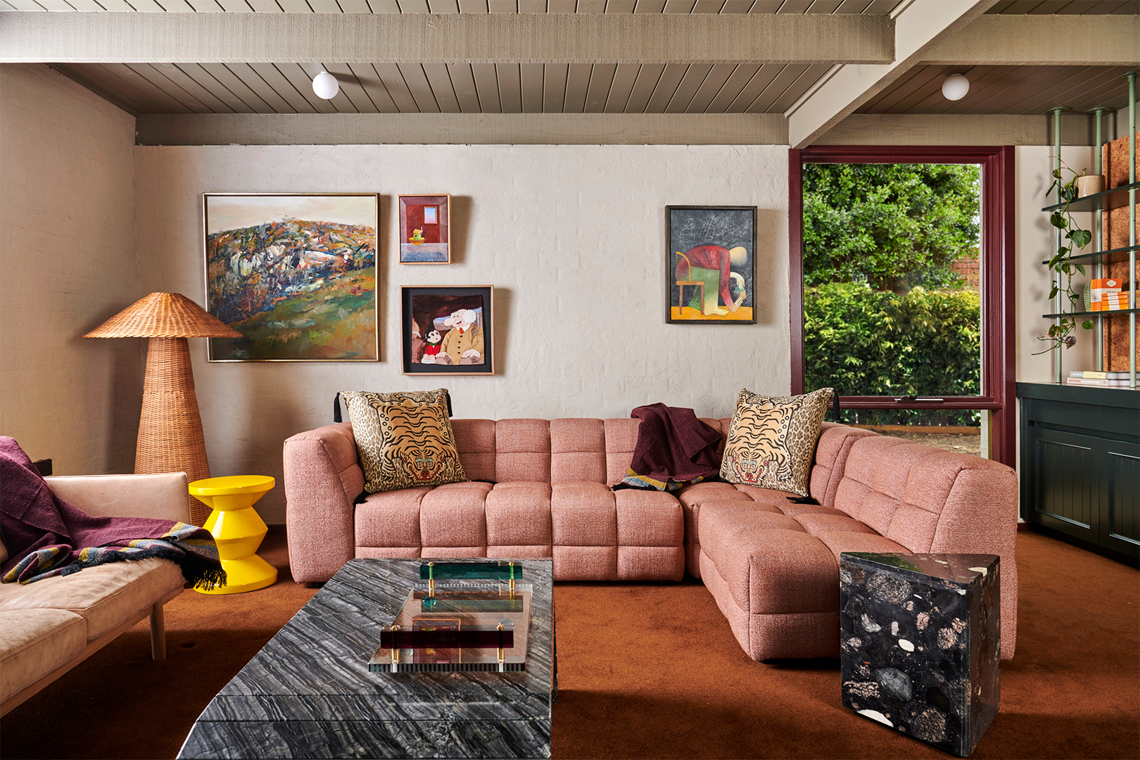 In addition to a jolly pup-patterned bedroom, the richly hued wool carpet from SuperTuft in the living room, an unexpected and retro pick, is a cheeky homage to Delves’s and Wilde’s love of their own dogs. “We both have Brussels griffons, and the carpet is the same chestnut color as their fur,” she says. Not only does it warm up the living room, it plays nicely with the sustainable and soundproofing cork TV wall.