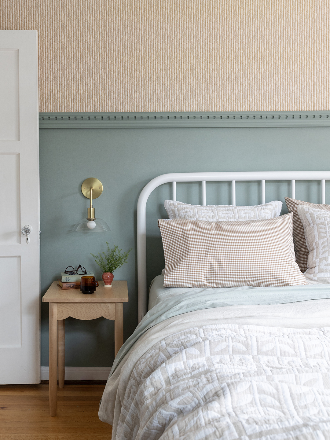 I probably lived with my bedroom just painted for two or three months, but I felt like wallpaper would totally change the space. I had a browser open on my computer and I’d look at wallpaper daily. I really wanted something subtle because I have a plaid rug. I chose the Ric Rac wallpaper from Spoonflower because, when you look at it from far away, the squiggles are so small that it almost doesn’t look like a pattern, it looks like a solid color.