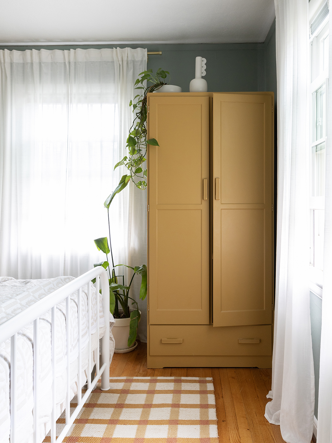 I found the wardrobe at a local thrift store. Someone had done a bad sponge-paint job on it, so I repainted it. My partner and I both work from home, and he uses the main closet in our bedroom as his workspace, so this (along with a living room closet) is where we store the majority of our clothes. I definitely led the charge on the DIY—he moved in with me after I had done most of the work, so it worked out for him!