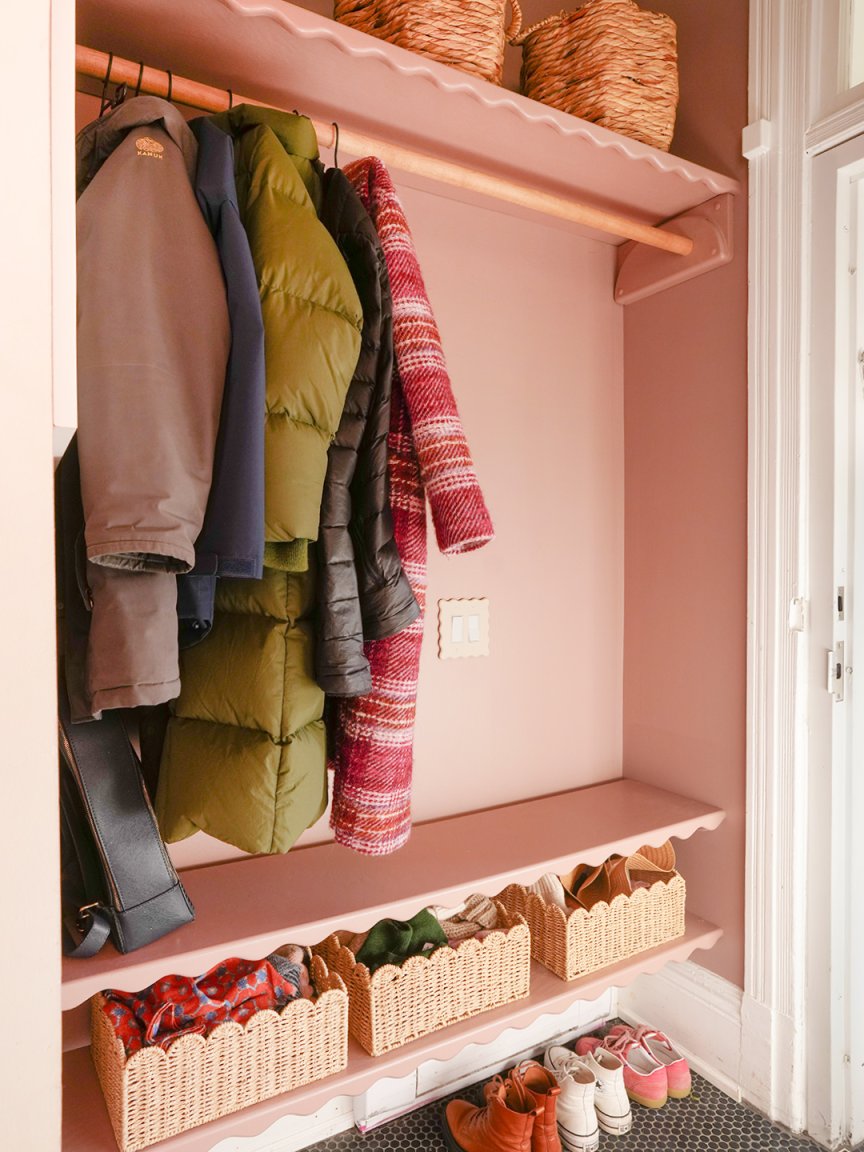 “It was so disorganized,” she says. “Our winter accessories were in baskets on a shelf that were out of reach, shoes were strewn at the door, and jackets were being piled on top of each other on coat hooks.” If that wasn’t bad enough, Gater also didn’t like that her love of all things pink and squiggly was nowhere to be found. “It lacked any sort of decoration,” she says. Gater aimed to streamline her entryway with solutions that felt personal yet totally relatable. Here’s how she pulled it off in just 34 square feet.