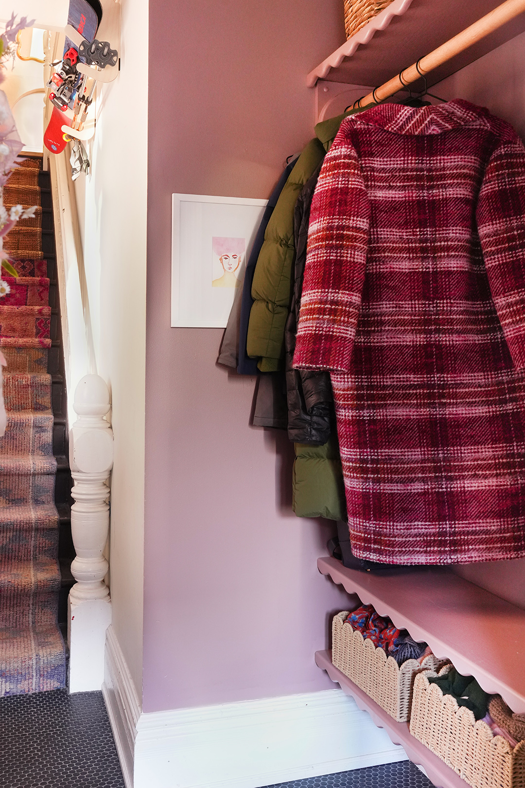 Initially, Gater went far outside her comfort zone and chose Periwinkle Bud by Behr, thinking that it would be refreshing to pick a color that wasn’t present in the rest of her mostly pink and green home. But when she applied the first coat to the walls, she knew it didn’t work. “I was really picturing an energetic and bright entryway,” she says. “But I realized that blue wasn’t the answer because it was feeling too cold.” Gater abandoned the plan and embraced a shade she was sure about: Sulking Room Pink by Farrow & Ball. “I ultimately ended up using one of my comfort colors, and it makes this space feel so cozy and warm rather than just utilitarian,” she says.