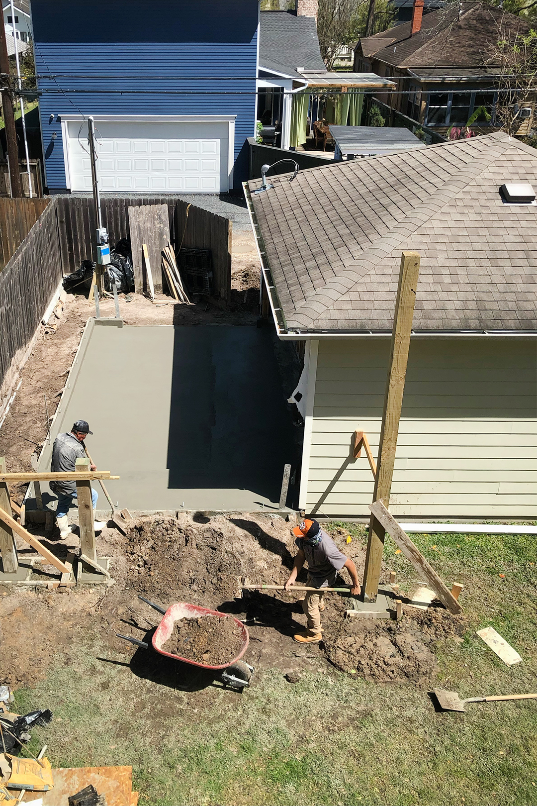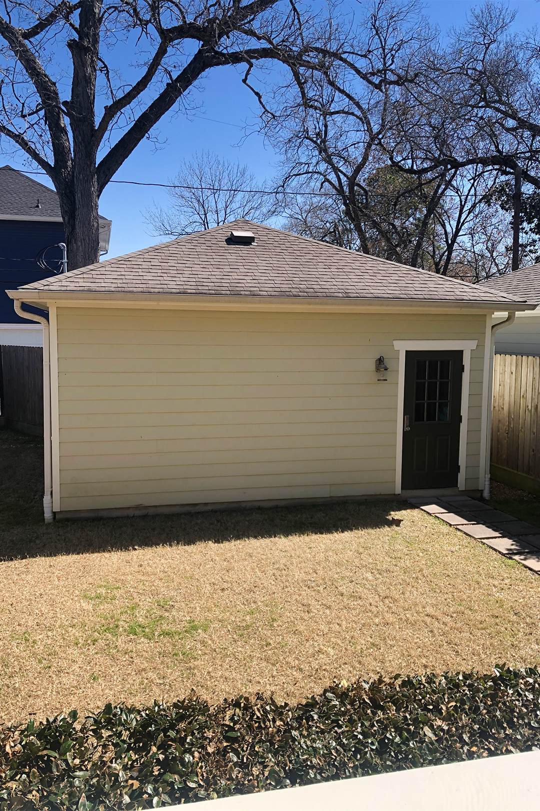 Before a dwelling could be added, a crew had to expand the garage from a two-car to a three. Any Houston property with an ADU is required to have a third parking spot, but the change had another lesser-known benefit: It offers more wiggle room for the couple’s oldest child, who is a new driver. From there, Hannah linked up with a structural engineer to figure out the inner workings of the framing.