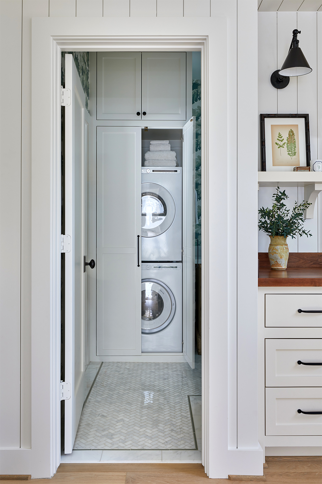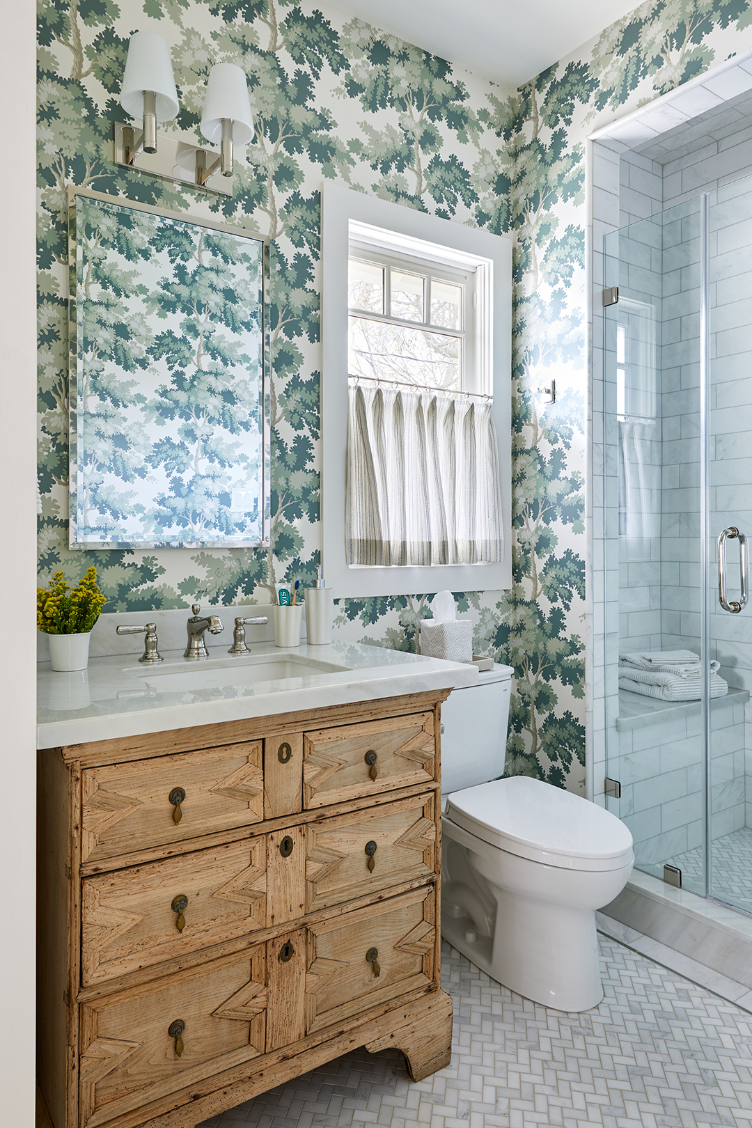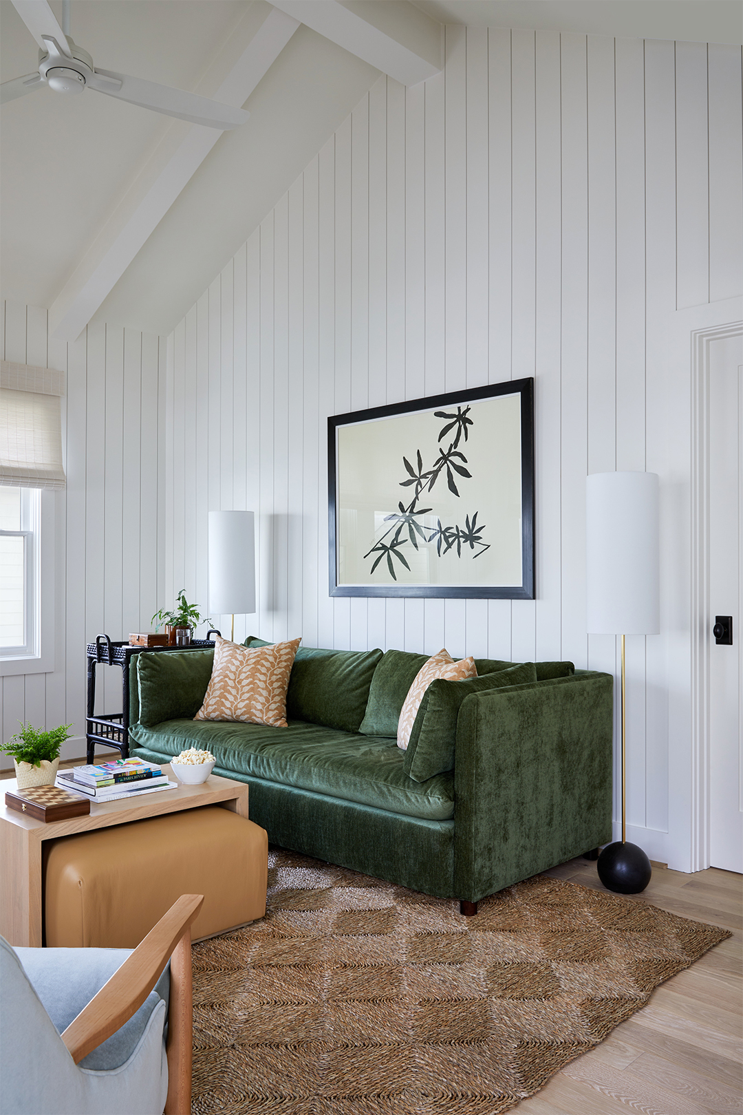 An easy way to ensure the inside of the apartment didn’t feel dormlike was to go big on wall texture. (The only place with plain Sheetrock is inside the closet.) “The shiplap really makes a difference and elevates the space,” says Butler of the treatment in the public areas. She then switched to wallpaper in the bedroom and bathroom. The whimsical leafy print in the latter was Butler’s subtle nod to the fact that the place is reminiscent of a grown-up treehouse—which explains why visitors are never in a rush to leave. “Our kids have had few opportunities to host friends because we’ve had nonstop guests since we completed the space,” says Shannon with a laugh. “Our family is genuinely over the moon.”