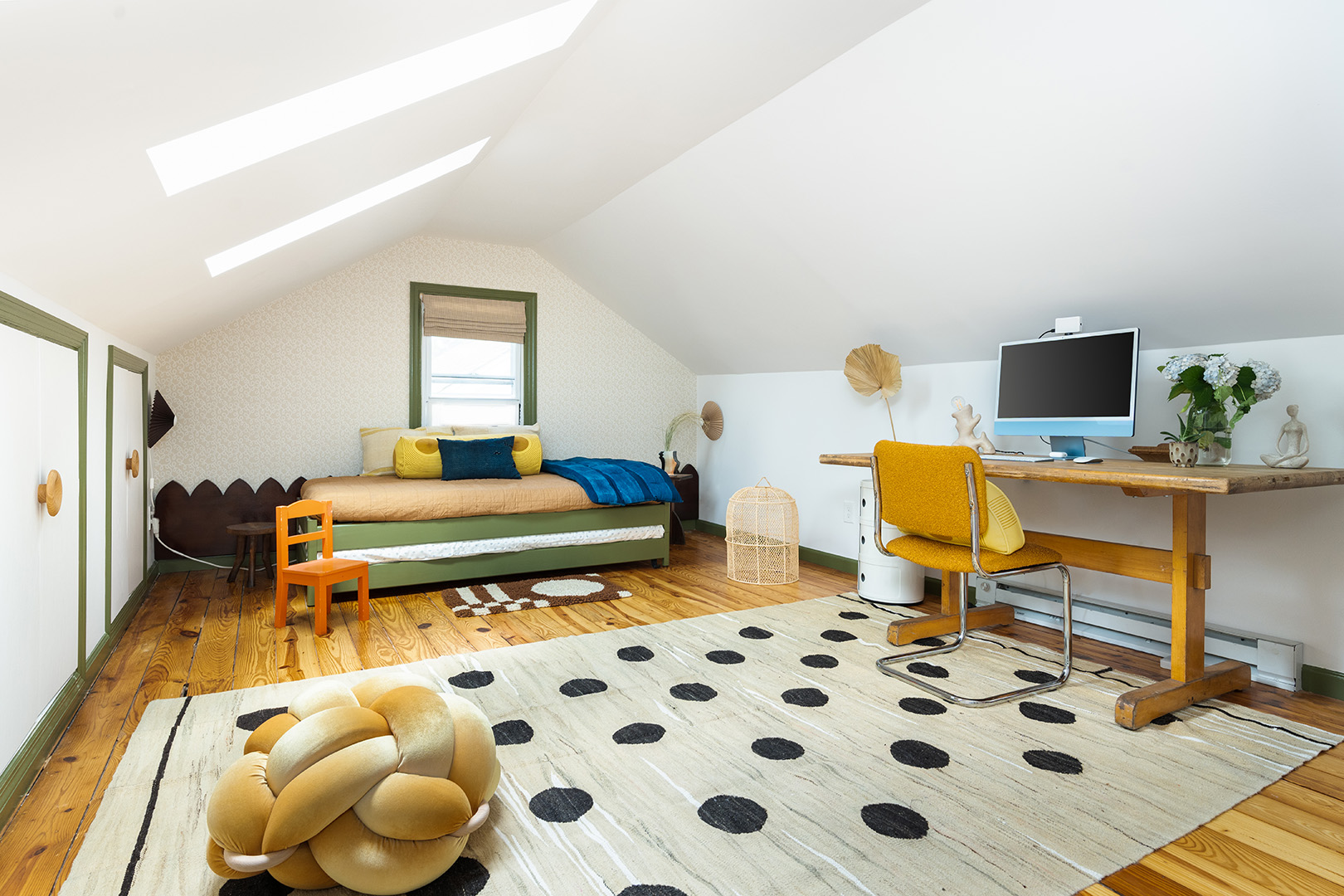 When Rodau first approached Velten about her attic conversion, she was hoping to transform the bonus space into a “peaceful, calming place” for her leadership building and executive coaching business. Rodau had already added skylights and tasked a carpenter with creating storage beneath the lower portion of the eaves, but she needed help from a pro to figure out how to make the most of the awkward area, especially since it would serve as the backdrop for her client calls. Then, months into the design process, she decided to move her HQ out of the house and instead use the third floor as an occasional office, guest room, and play zone for her and her partner Daniel’s 4-year-old son, Dax. Ahead, Velten takes us through the new and improved reno.