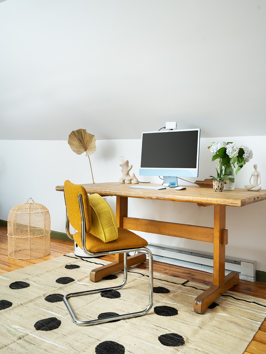 Thrifting furniture was a choice Velten made with sustainability in mind, but also Rodau’s guests. The trestle table from Olde Good Things, tubular steel chair from Cherin Studio, and iconic Componibili storage unit support Rodau’s work-from-home setup but don’t scream “office,” so no one will feel like they’re intruding when they’re invited to spend the night.