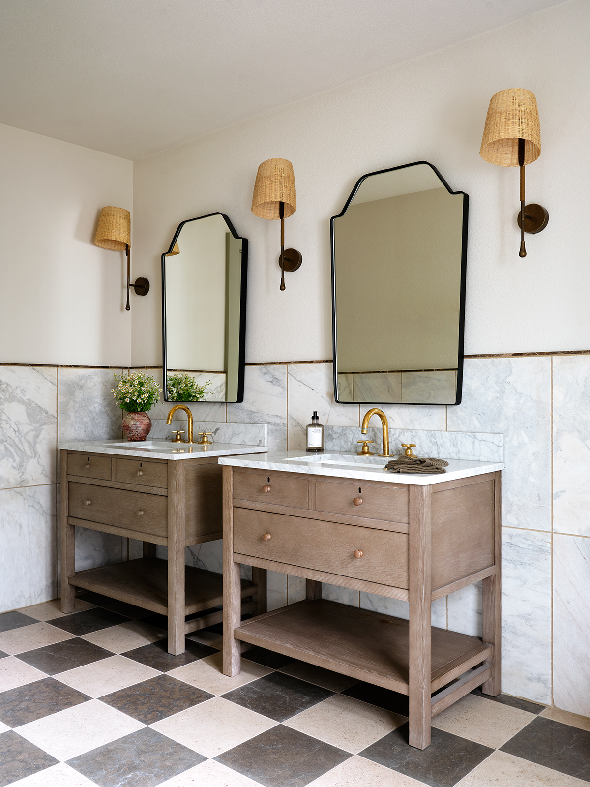 The key to any speedy reno is relying on quick-ship, in-stock items when possible. The vanities in the primary bathroom and powder room are from Pottery Barn. Casey opted for two individual pieces in their own space for the simple fact that one long vanity tends to become a junk collector. “I think this keeps us a bit tidier,” she says.