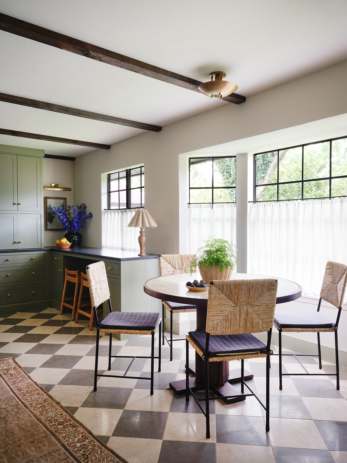 Wanting the house to feel more historic than it actually is, Casey steered clear of bright white paint. Instead, Benjamin Moore’s Fossil hue, which “feels warm and a little buttery,” she notes, became her go-to. Another way she makes a place feel older? Contrasting trim. All of the baseboards, as well as one of the guest bedrooms, are covered in Nantucket Gray, also by Benjamin Moore. “And always paint the trim around your door the same color as the door. It’ll make it look bigger,” she suggests. Casey also swears by color drenching: If you’re painting the walls a color, you should use the same shade on the ceiling, too. “It feels so much more intentional and higher-end,” she adds.