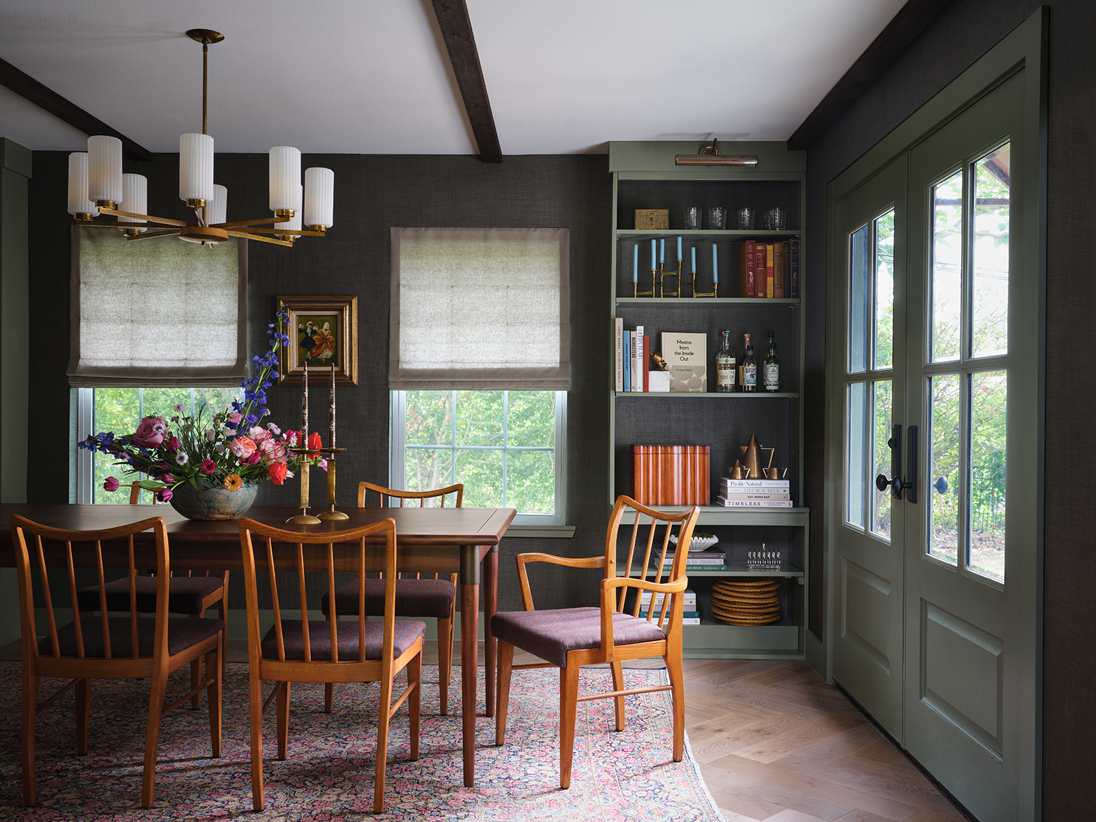 But it wasn’t just about saving the things that were already in the circa-1982 Tudor-style house—it was also taking into account what they brought in. The bookcase in the dining room was a $200 Facebook Marketplace score that Casey framed out and painted to look like it had always been there. “So much of what people are pulling out of houses is better construction, better-quality wood than anything you can buy new now,” she points out. The bonus? The seller, who was moving into a retirement facility, included her entire library of books with the purchase. “She was so happy to see them going somewhere great,” says Casey. Discover more bright ideas from her scrappy remodel, ahead.