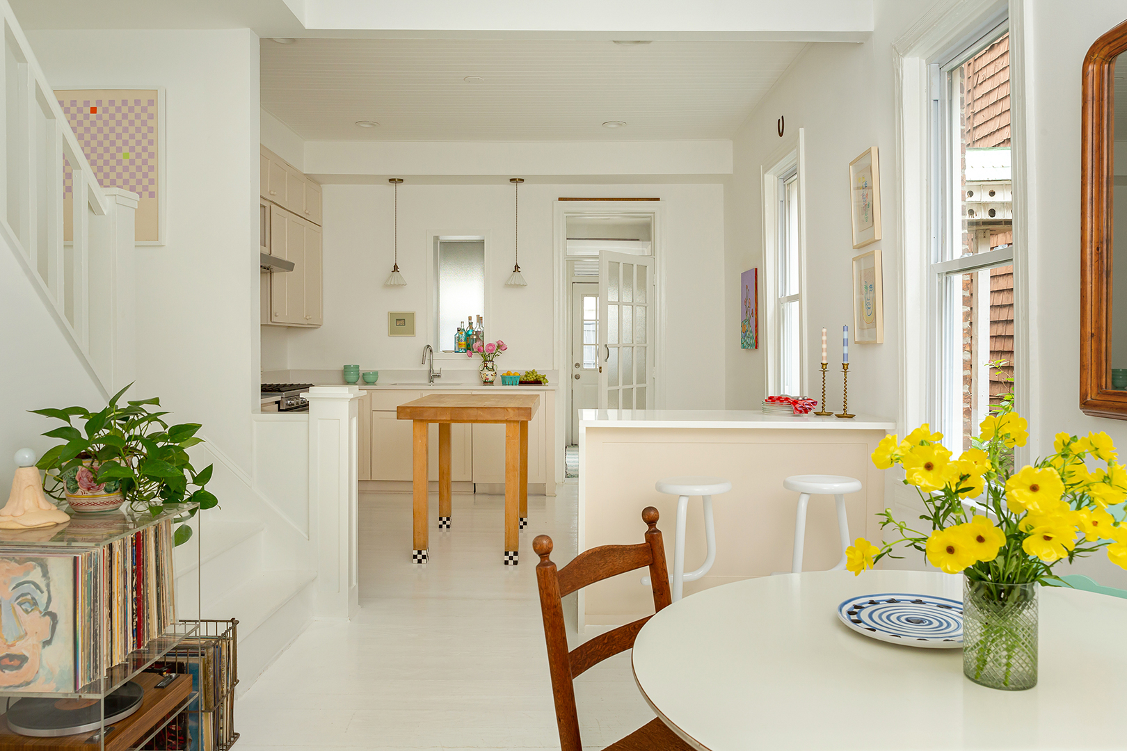 Not only was the ceiling fan a bit dated and prone to grease, I felt like the black blades made the ceiling appear lower than it really was, which isn’t what you want in a small space. I removed it and covered it with a simple plate from Home Depot, then replaced the distracting can lights with seamless LED ones ($22 per piece). On a trip to Brooklyn, I bought two vintage pendant lamps from Holler & Squall that act almost like jewelry for the room, like when you’re getting ready to go out and you complete a simple outfit with strong earrings.