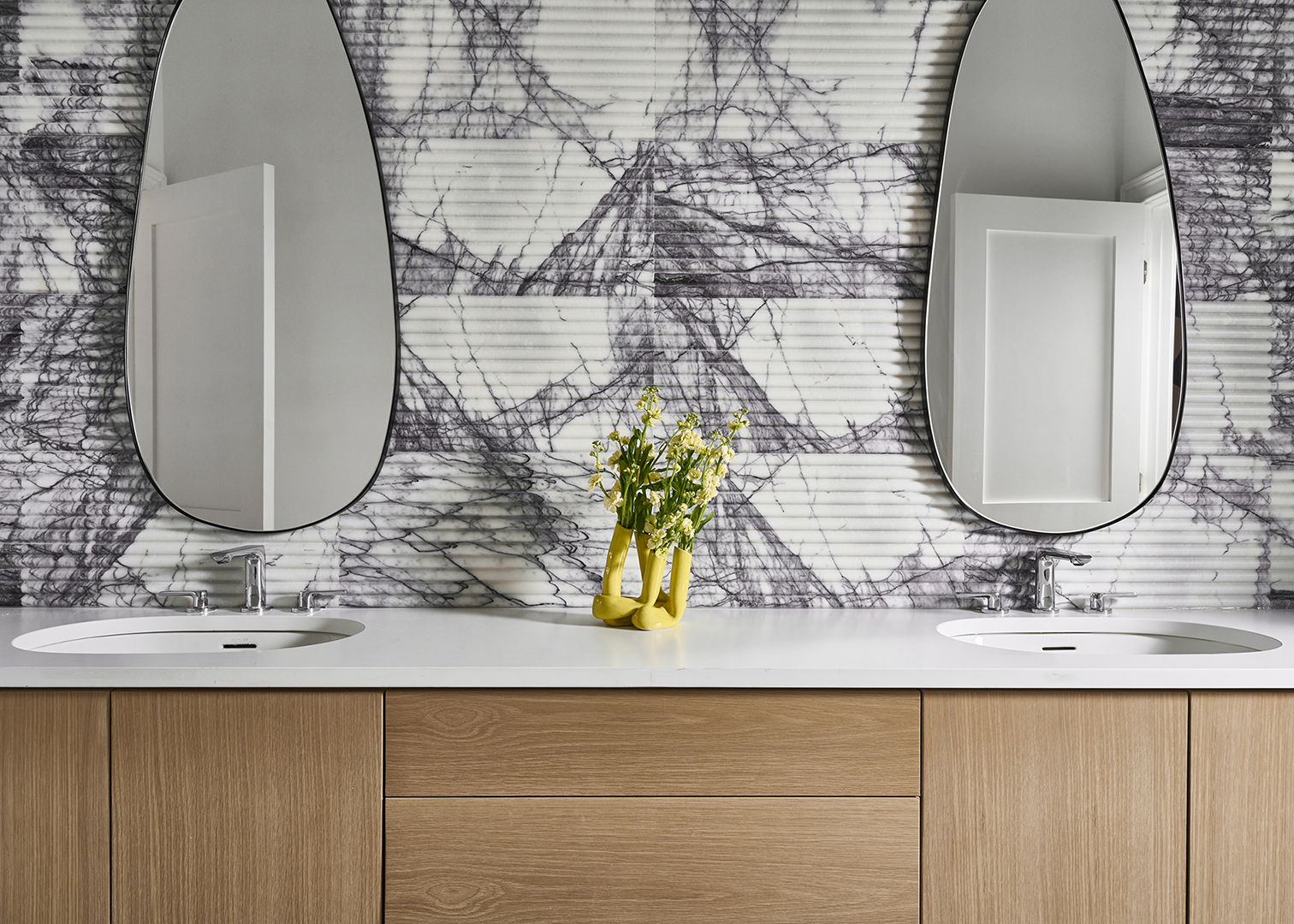 “I knew this was a good place to take a risk because it’s a Jack and Jill bathroom between two guest bedrooms, so it’s not something that someone will experience every day,” she says. “I balanced the intense marble with a neutral white quartz countertop, white sinks, and a natural wood vanity. Then I added a sculptural vase by Julia Elsas, a ceramicist in Brooklyn, to add some funk to the space.”