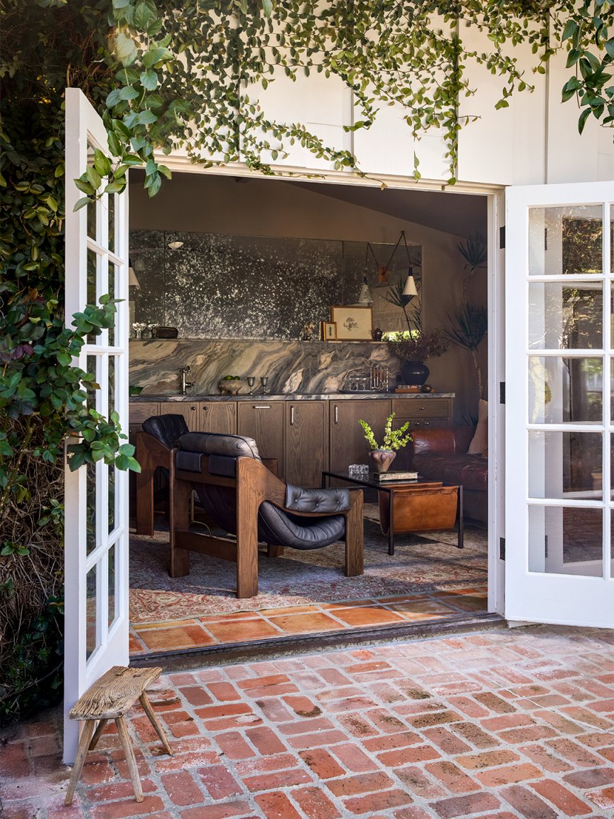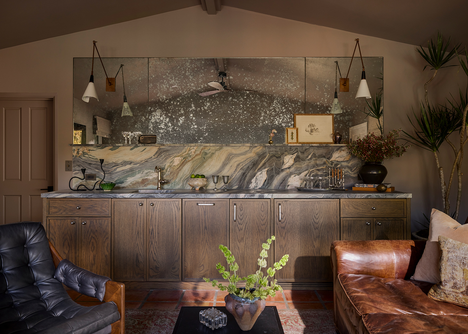 The guest house is now part pool bar, part cigar lounge, part PlayStation den. An antique mirror and lots of leather dialed up the moodiness factor while a low pile rug keeps things practical for friends walking in with wet feet. The designer tricked out the stained oak cabinetry with a paneled mini fridge, wine cooler, and ice maker and topped it with a leathered quartzite fittingly dubbed “fusion blue explosion.”