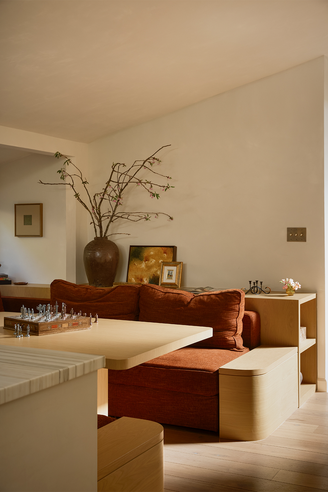 While Abi-Naked wants to put her own touch on a house, she’s also game for what her clients have to bring to the table. In the case of the kitchen, that was a large modular sectional. The designer upholstered the U-shape piece in a maroon fabric and surrounded it in millwork to create the feeling of a built-in banquette. She even designed a custom table to match the light oak wood. “They love having game nights, so the goal was to create a space where 10 people could sit around and play,” she says. The cabinets on the ends of the bench are the perfect size for stashing Monopoly boards.