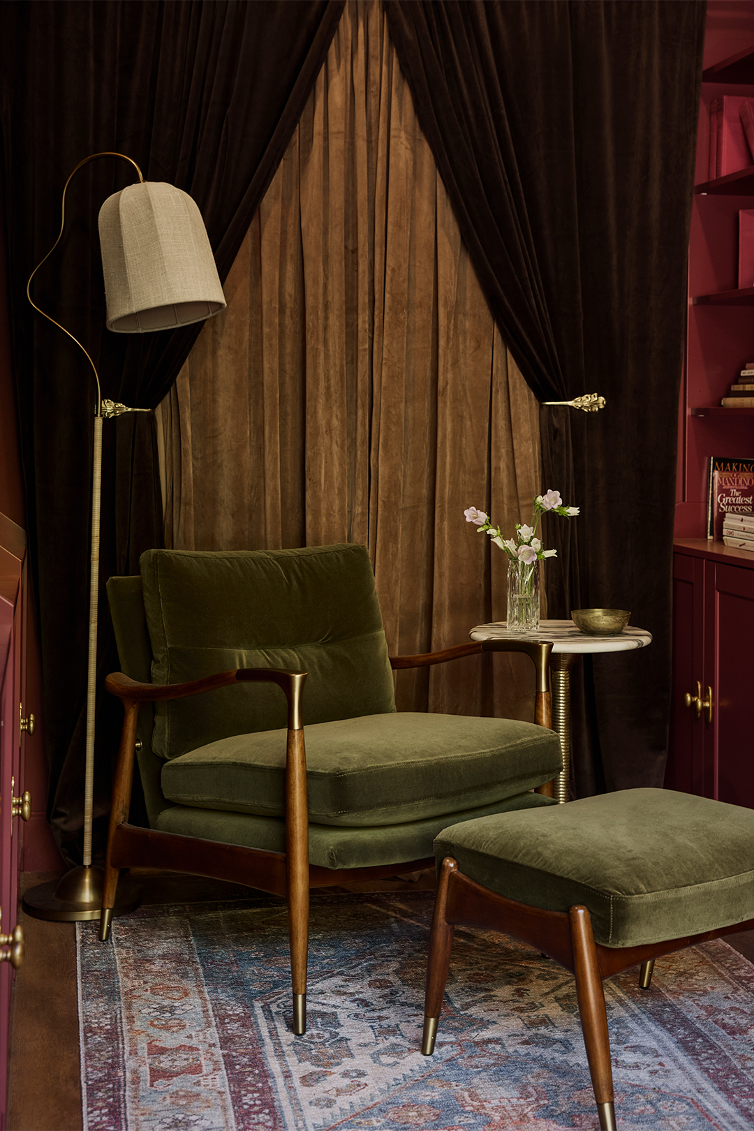 The initial plan was to fill the shed with gardening gear, but when the designer learned one of her clients is a bookworm, she came up with a better use. Using IKEA bookcases (custom woodwork wasn’t a justifiable splurge for such a small space), she turned it into a cozy library. The doors and shelves are painted in Benjamin Moore’s Classic Burgundy while a backdrop of velvet curtains hides an awkward window at the back of the structure. This is no place for a lawn mower.