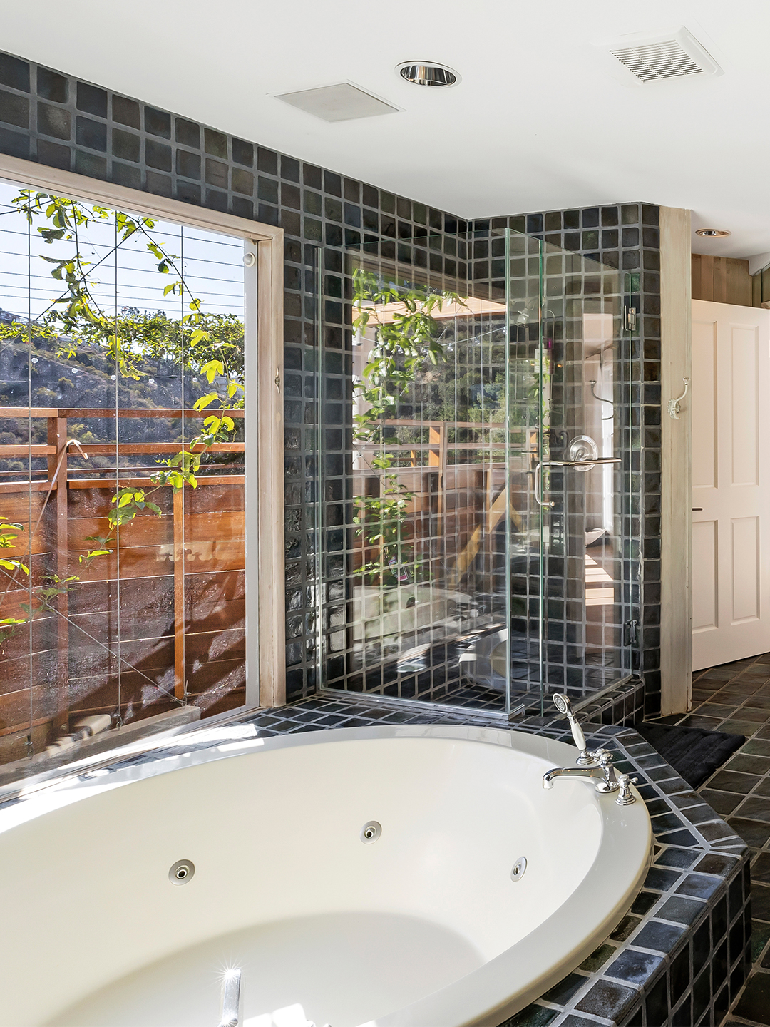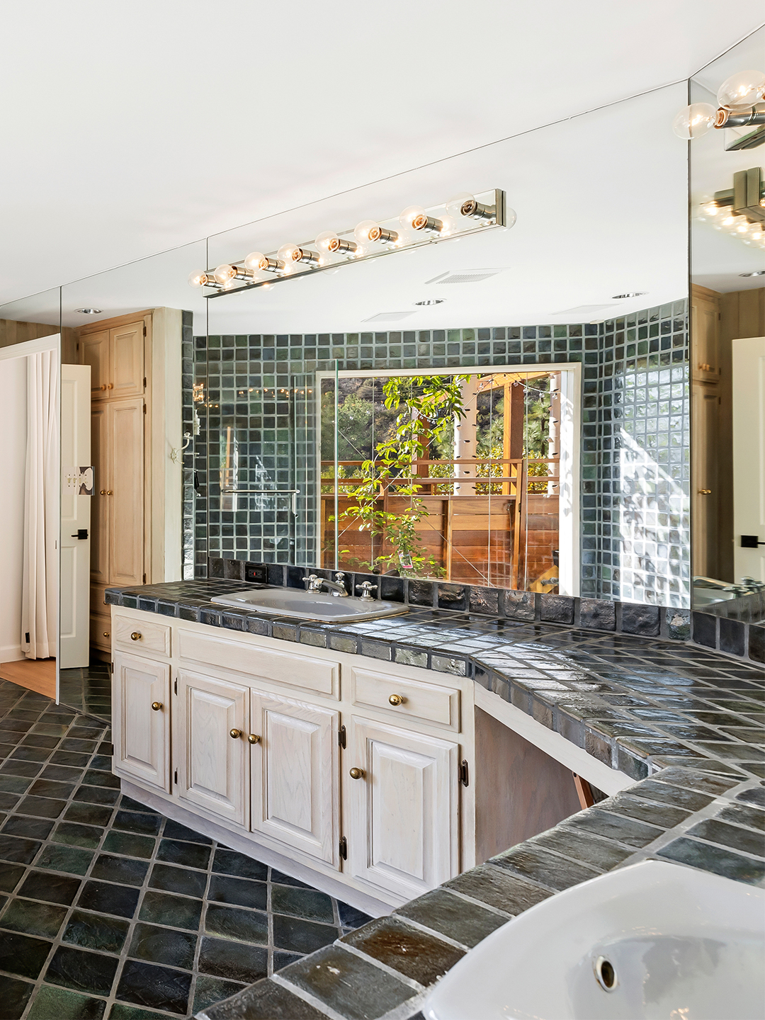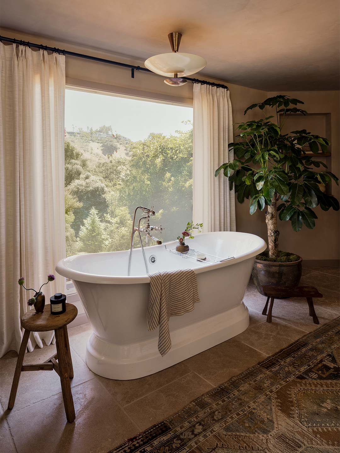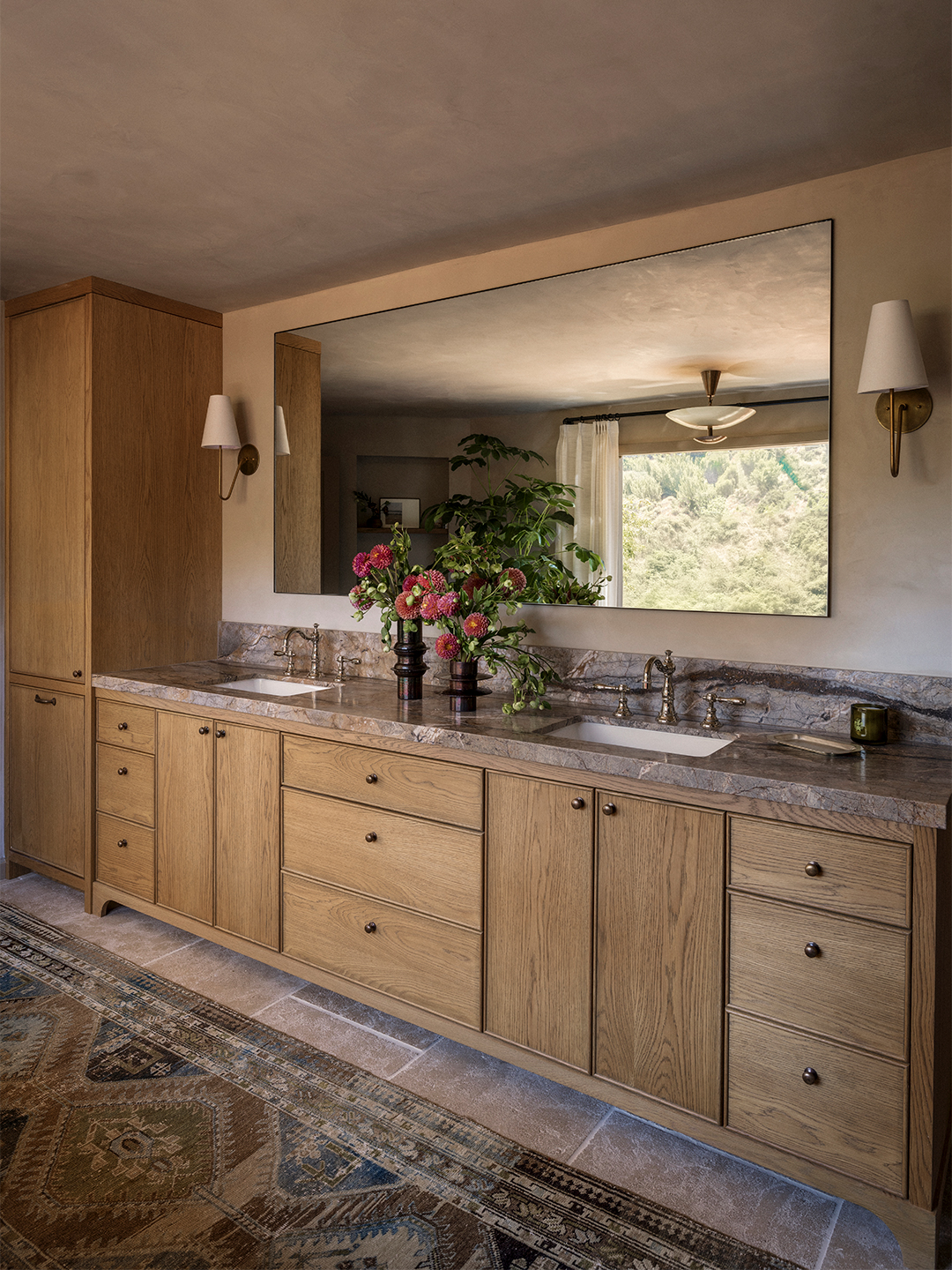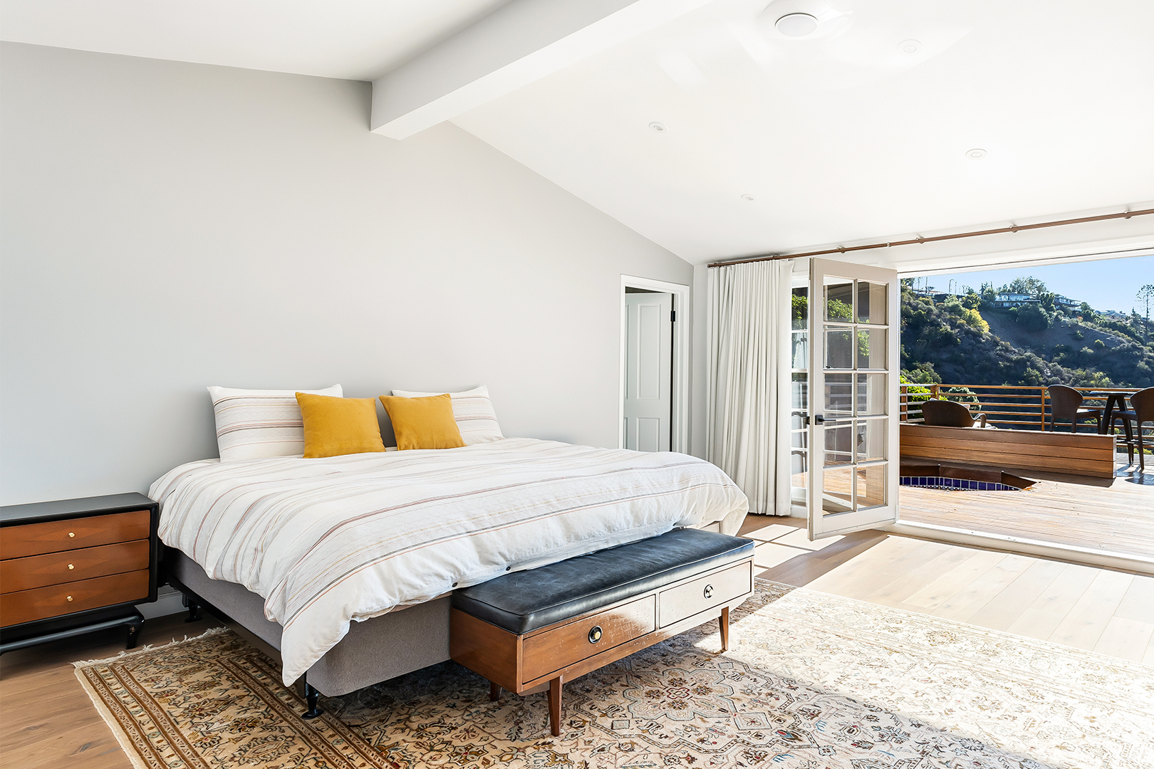 Before Abi-Naked started sketching up ideas and sifting through stain options, she took a good hard look at the bones of the house. It was flooded with light thanks to the abundance of French doors and skylights, but the layout was quirky. “I was like, why am I walking through the closet first before I get to the bedroom?” she recalls. The home’s bathrooms (one of which is located in the guest house) were also asking for a gut job. Ahead, the designer takes us behind the scenes of the renovation.