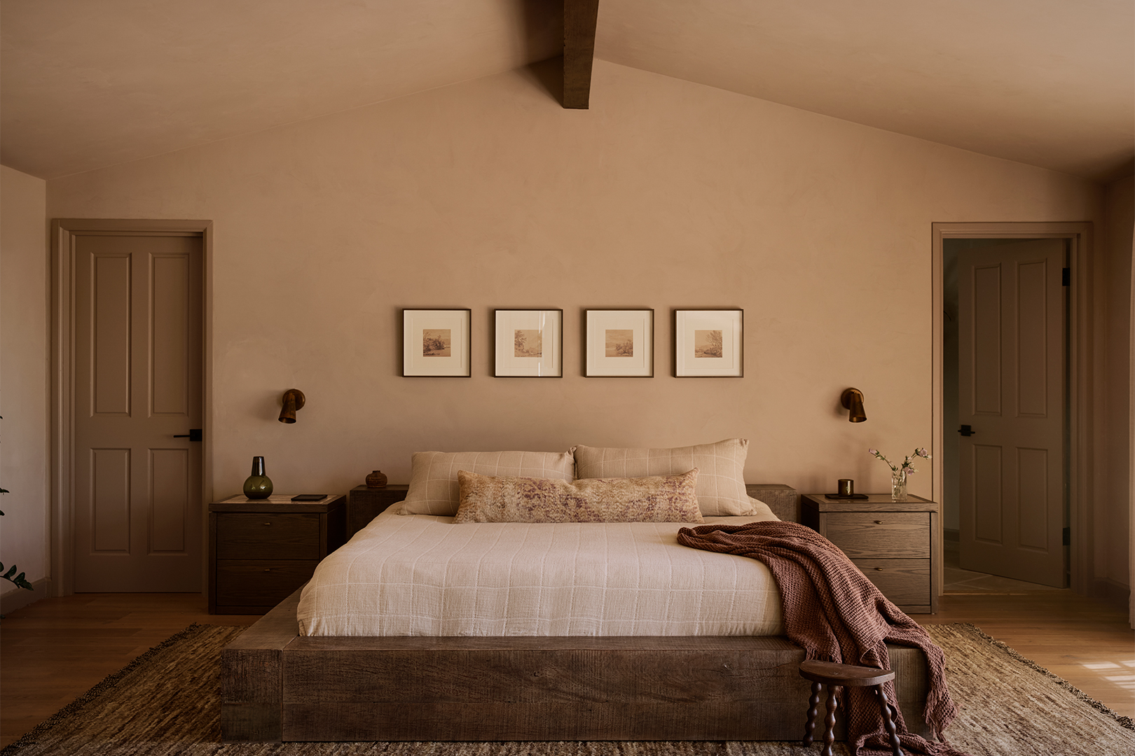 The homeowners also didn’t want to part with their bed frame, so the designer riffed off the dark wood piece in the primary bedroom with a rich stain on the beams and Portola Paints’ Rustica Roman Clay on the walls. “I like finding ways to use elements clients really love from their past and not just getting rid of everything,” says Abi-Naked.
