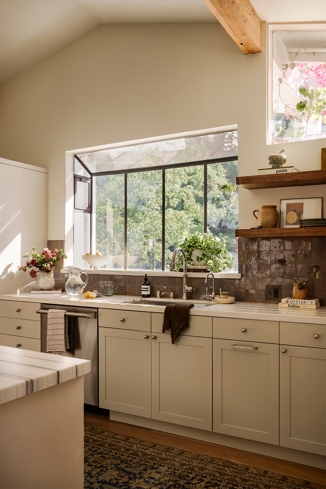 An easy way to elevate the kitchen without fully gutting it was to remove the upper cabinets that were stealing light from the large window over the sink. She replaced them with two thick floating shelves that match the ceiling beams. The existing cabinets got a fresh paint job with Sherwin-Williams’ Naturel and aged nickel hardware (Abi-Naked swapped out many of the pulls for knobs). She also didn’t see a reason to rip out the marble countertops, so she simply had them honed to take off some of the shine.