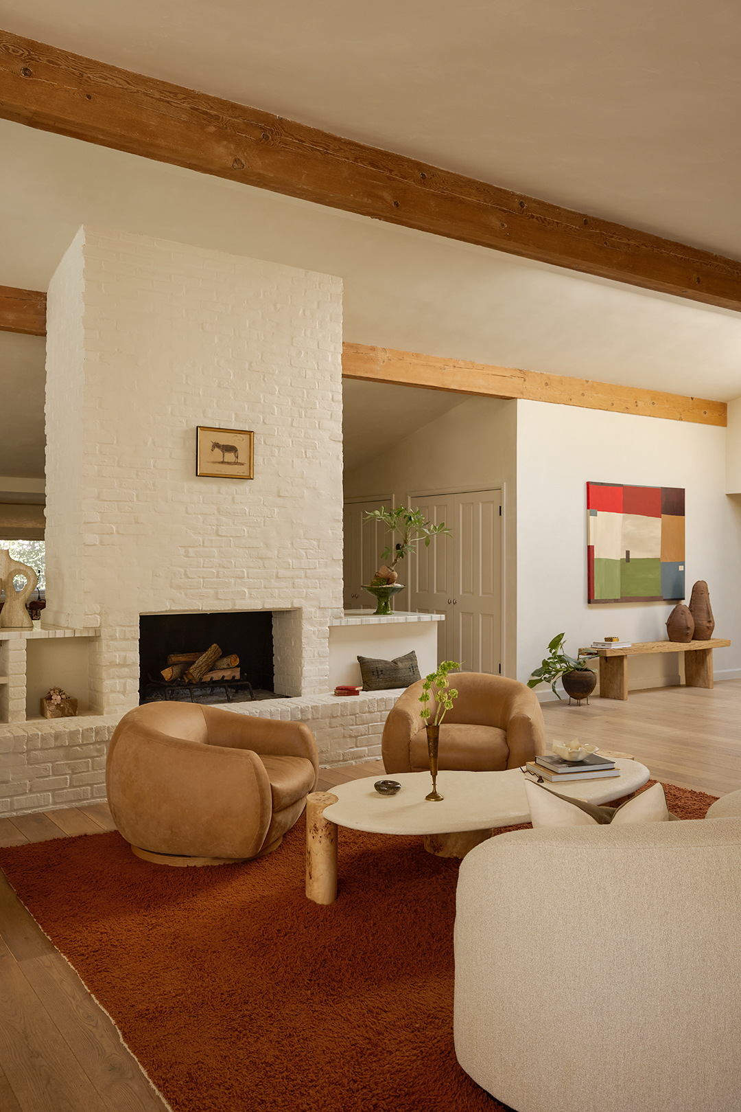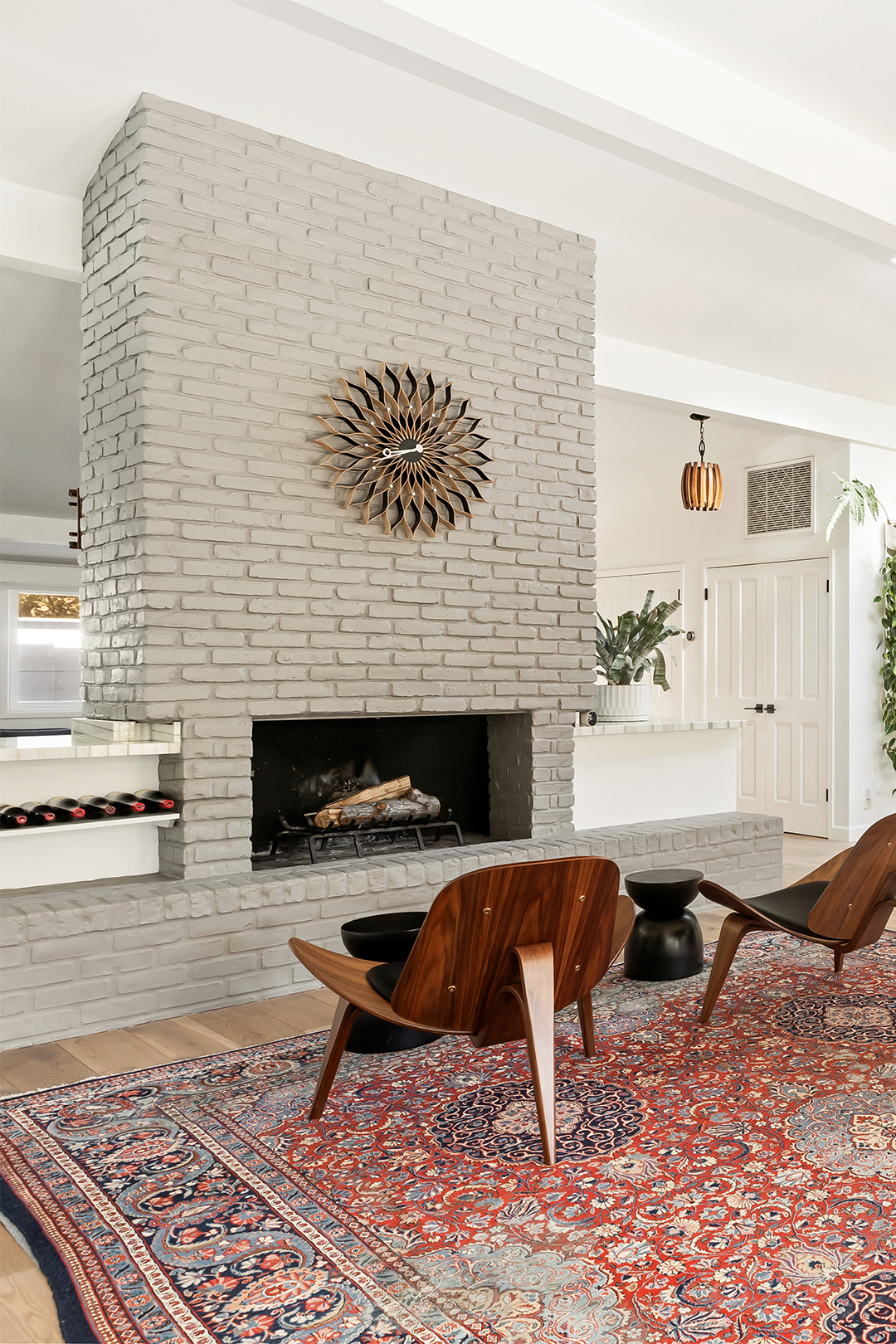The gray brick fireplace needed a bit more of a pick-me-up. Before painting it the same white hue as the Roman Clay walls (just 20 percent lighter), she filled in many of the deep gaps with grout to avoid any dark shadows. “The edges of the brick almost disappeared in some areas, it just felt a bit more lived-in,” she says.