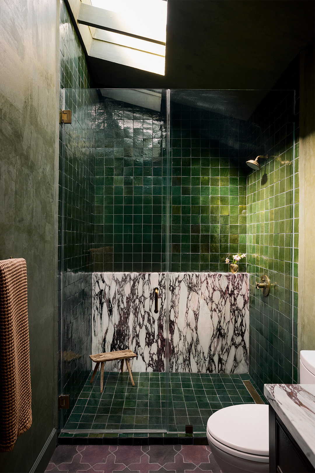 The one and only nod to the old guest bathroom’s ways: 4×4 tiles. Between the verdant shade of green zellige and the large skylight overhead, “it almost feels like you’re in the jungle,” she says. “It magnifies the colors so much more.” Rather than carve out a niche within the new tile, Abi-Naked chose a sleeker solution: the shelf of a Calacatta Viola marble slab.
