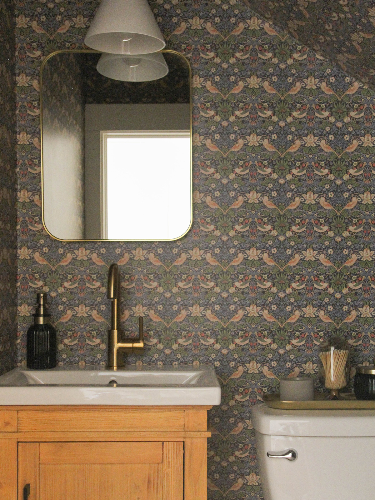 We focused the majority of the budget on areas that needed a more significant overhaul, like a new kitchen, and adding a new bathroom directly above. Then for 50 percent of the home’s footprint, we did solely cosmetic work. We also kept a lot of the original details, sometimes because we didn’t have the budget to change them, but also because they brought character—stone fireplaces, exposed beams, a teeny-tiny powder room that we covered in floor-to-ceiling wallpaper, and sloped ceilings that we converted into a bunk room.