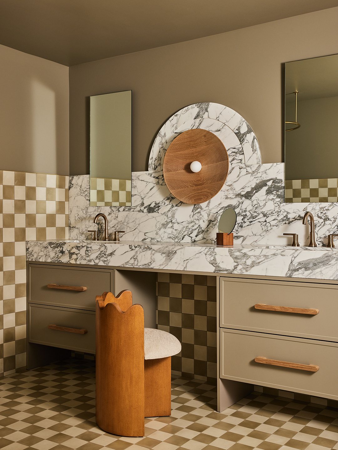 Two of IKEA’s two-drawer Godmorgon vanities form one extra-long vanity in designer Sarah Sherman Samuel’s guest bathroom. By tapping into her line for Semihandmade, she was able to swap the drawer fronts for soft gray-green ones with a slim profile, before topping the pieces with a thick slab of marble.