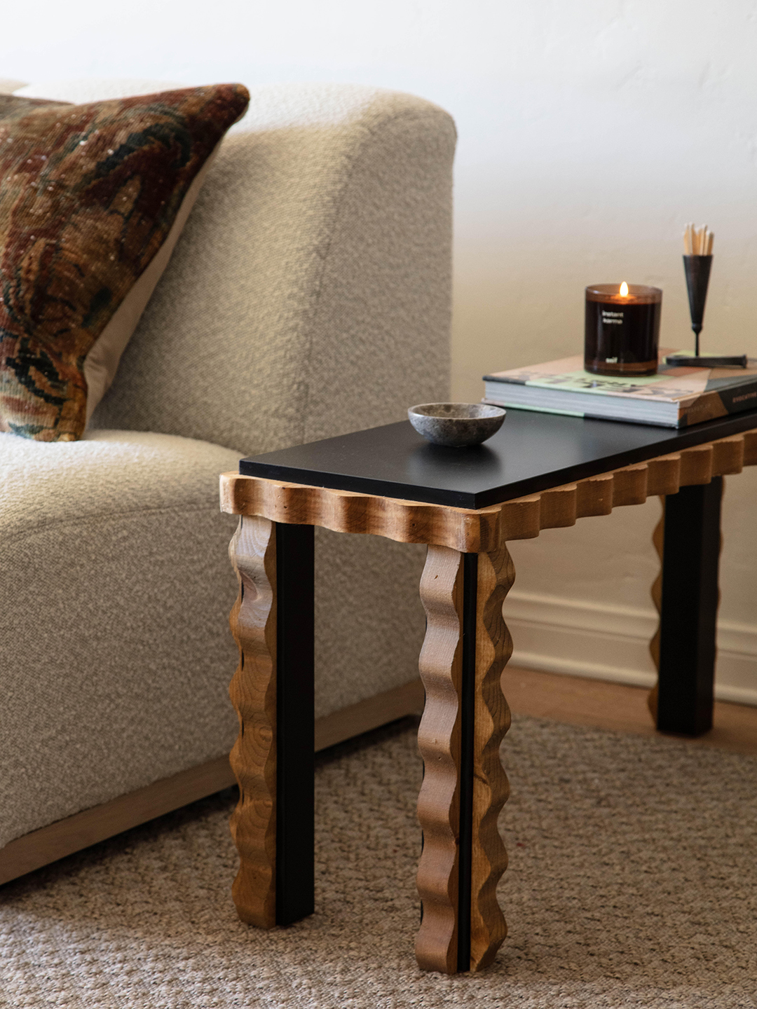 For $45, seasoned DIYer Drew Michael Scott added sculptural trim to this ordinary TV stand. (Psst: The wavy wood he bought from Lowe’s is technically meant for roofing.) After cutting the long slivers to his desired dimensions, he applied a stain by Puritan in a dark pine color and attached them to the table with a brad nailer.