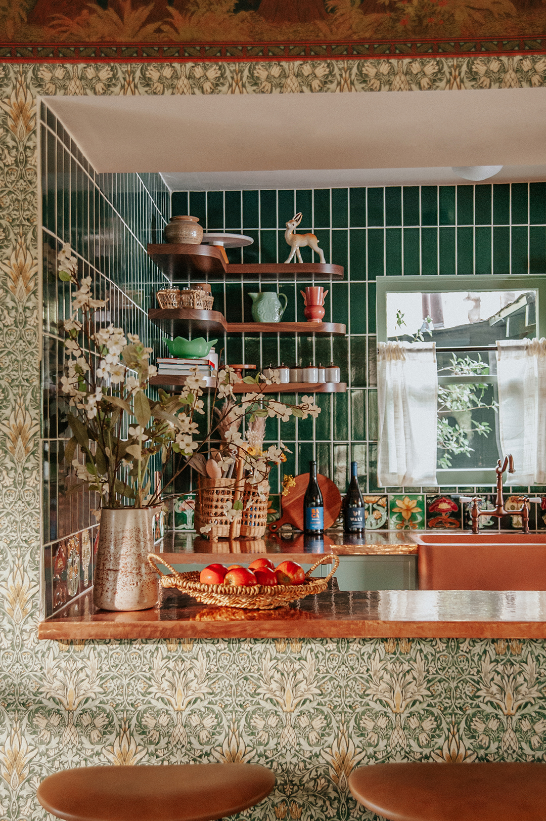 Thomas stuck with her initial jumping-off point and introduced other elements that look like they could have been in the house for more than a century. The curved open shelves felt Gamble House–worthy, and she swathed the breakfast bar wall in a combination of two antique-inspired prints (the frieze is from Bradbury & Bradbury, which specializes in 19th- and 20th-century wallpapers, reproducing historic patterns and reinterpreting them with alternate colors). “It’s of the California redwoods, which is a little farther north, but I thought it was a nice accent and gives the house a real sense of place and time period,” shares Thomas. When in doubt, consult the history books.