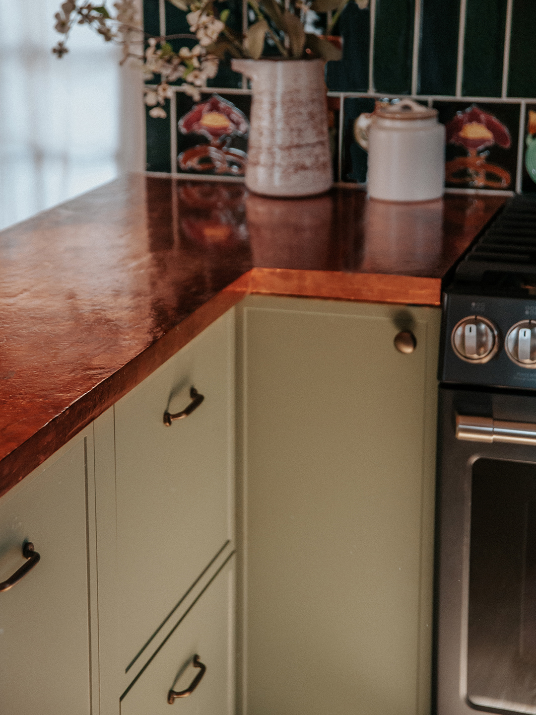 Copper might be less glamorous than popular brass, but it’s significantly cheaper and ages beautifully. “It’s one of those things where the more stains, the better,” shares Thomas, who chose the metal as her big accent moment, scooping up 1920s French copperware, copper outlet covers, a copper sink, and even copper countertops. Her contractor made the worktop from scratch by cloaking one-and-a-half-inch-thick plywood boards, cut to size, in large metal sheeting and securing the top layer with an epoxy adhesive and nails. “If you can wrap Christmas presents, you can wrap this,” says Thomas.