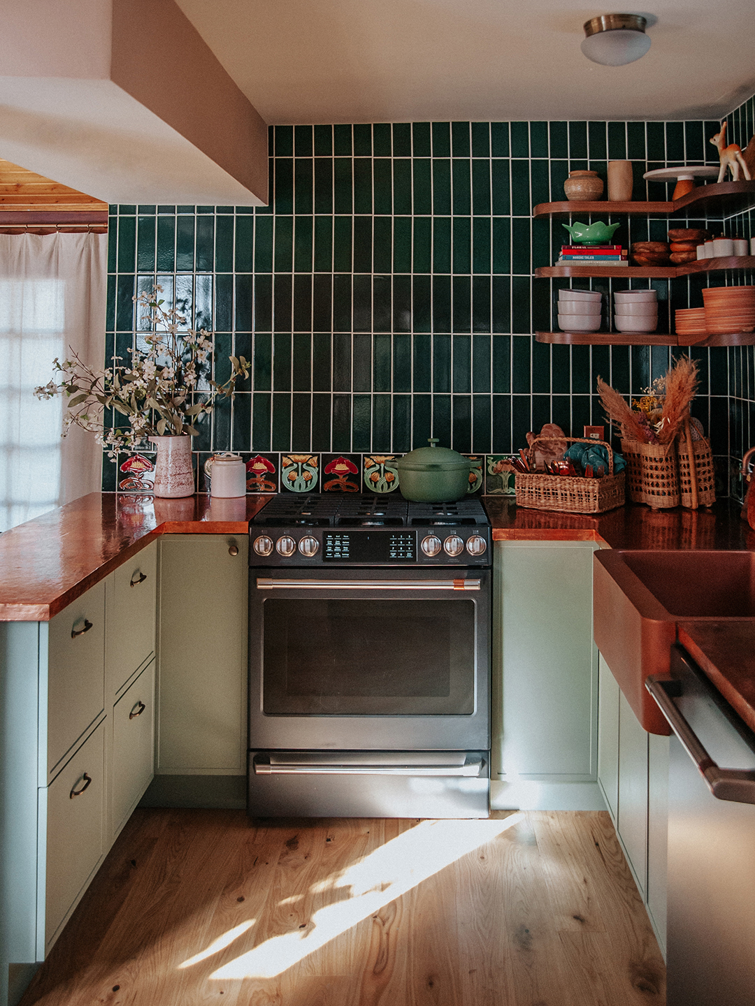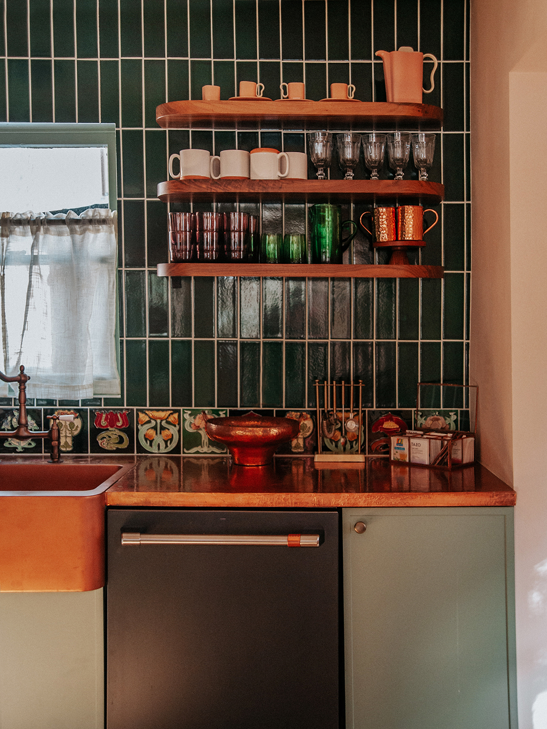 When you work on as many homes as Thomas does (she’s frequently helping friends in addition to refurbishing her own homes and vacation rentals), you accumulate surplus material. And in her case, specifically, boxes upon boxes of tile. “And I never know what to do with it,” she says. This kitchen proved to be the perfect opportunity to use up leftover green tile from her business partner Laurel Gallucci’s bathroom makeover. To top it off, Thomas went by Eric’s Architectural Salvage in L.A. and sourced thirty 100-year-old English tiles with varying motifs. Each one cost around $30, but the fact that they were authentic to the era of the house made them worth the splurge.