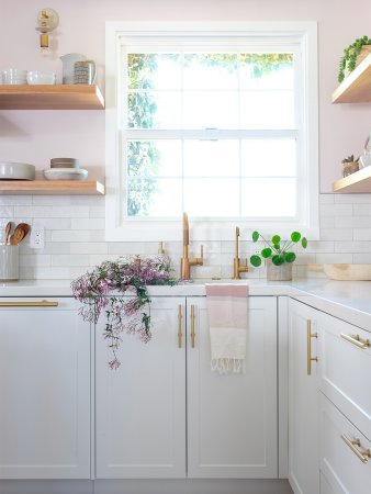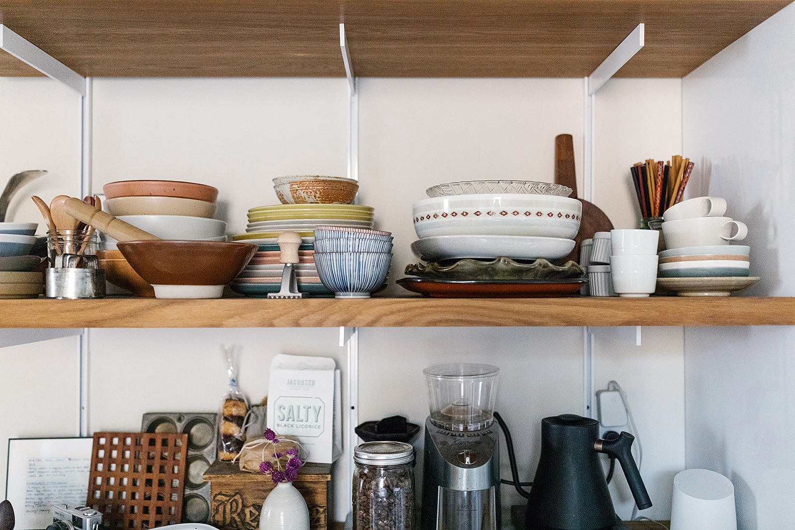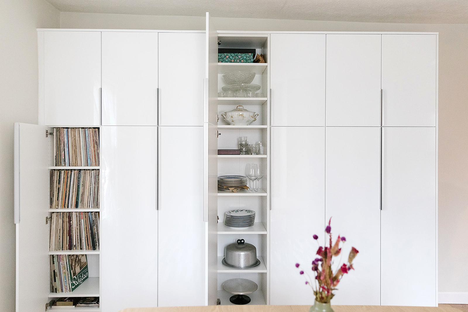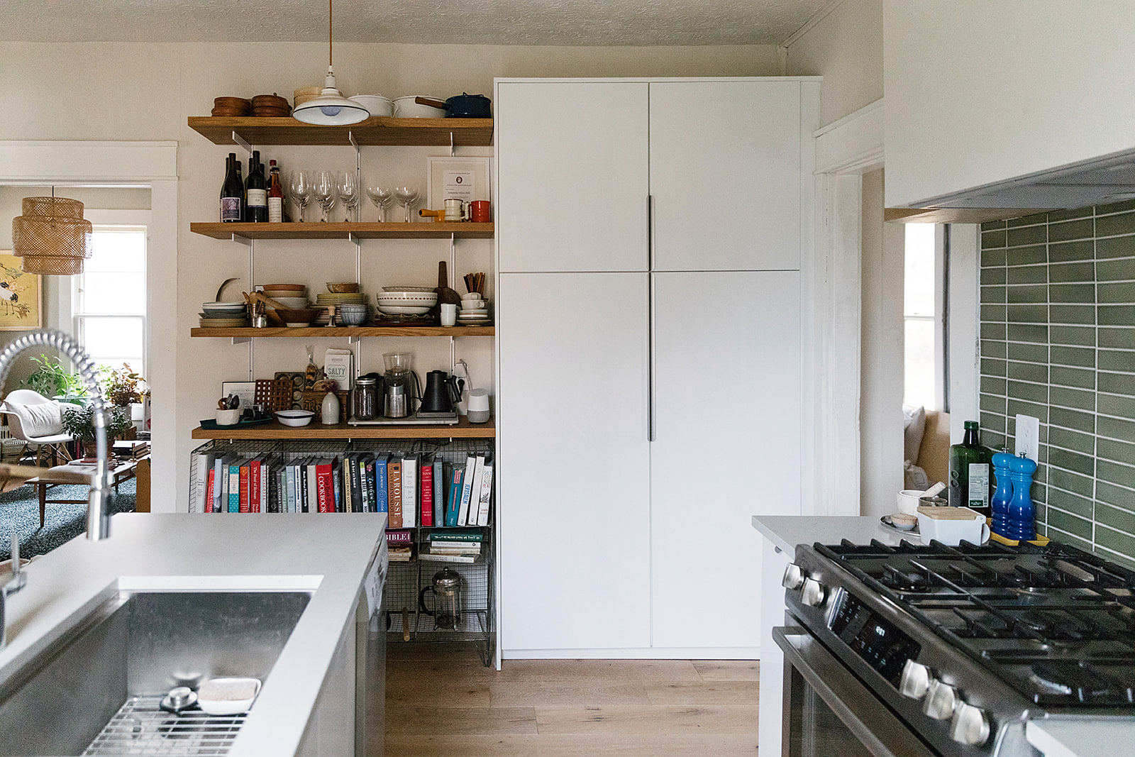 At first, Sam questioned whether shiny white cupboards from IKEA were the correct fit aesthetically for her circa-1900s bungalow, but she was convinced it was the right move after she heard artist and designer Maya Schindler rave about how easy it is to wipe down hers. Plus the inner workings of the Swedish brand’s units are easily modified—the one closest to the breakfast bar serves as the pantry. “I’m a massive fan of drawers,” Sam says. “Then you’re not digging through everything constantly.” The cabinets in the dining room hold so much more than extra cookware: They’re a place to store records, rarely used china, and dog food. “It’s a catchall,” she notes. Refreshing the storage in both rooms came to a cool $10,000.