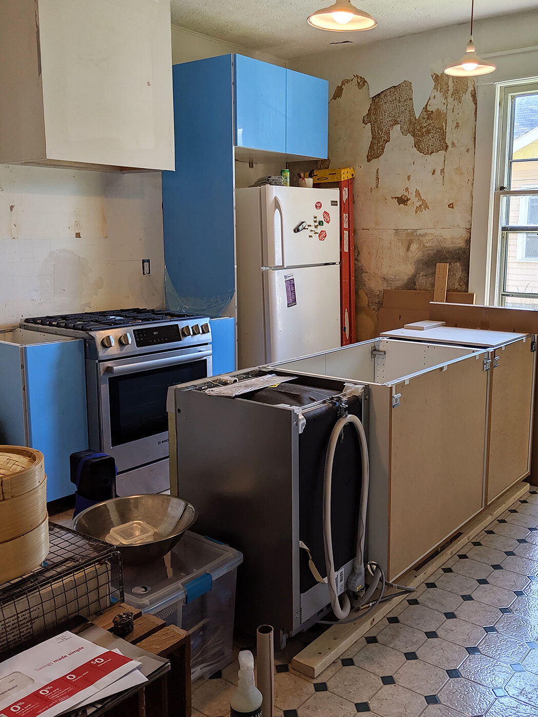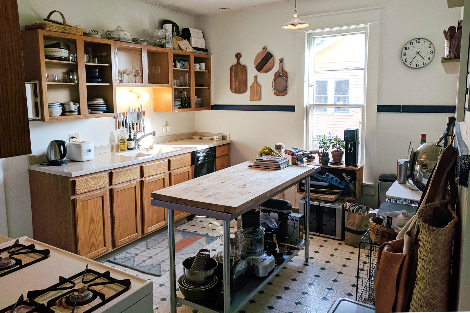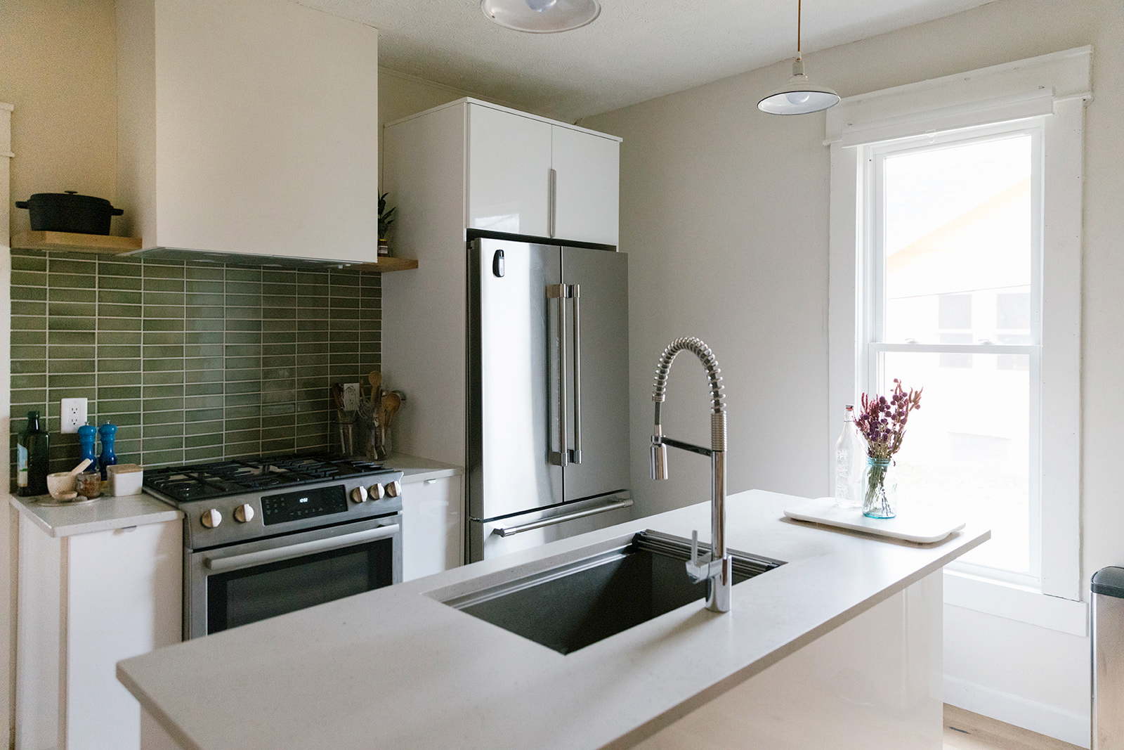 Dropping a proper island in the center of the kitchen offered an opportunity to play appliance Tetris. First off, it provided a more sensible location for their new stainless steel dishwasher and $500 Ruvati sink (complete with cutting board, garbage disposal, drying rack, and strainer). With those bits and bobs out of the way, Sam and Alex could shift the refrigerator and the oven to the main wall, resulting in the ever-sought-after work triangle.