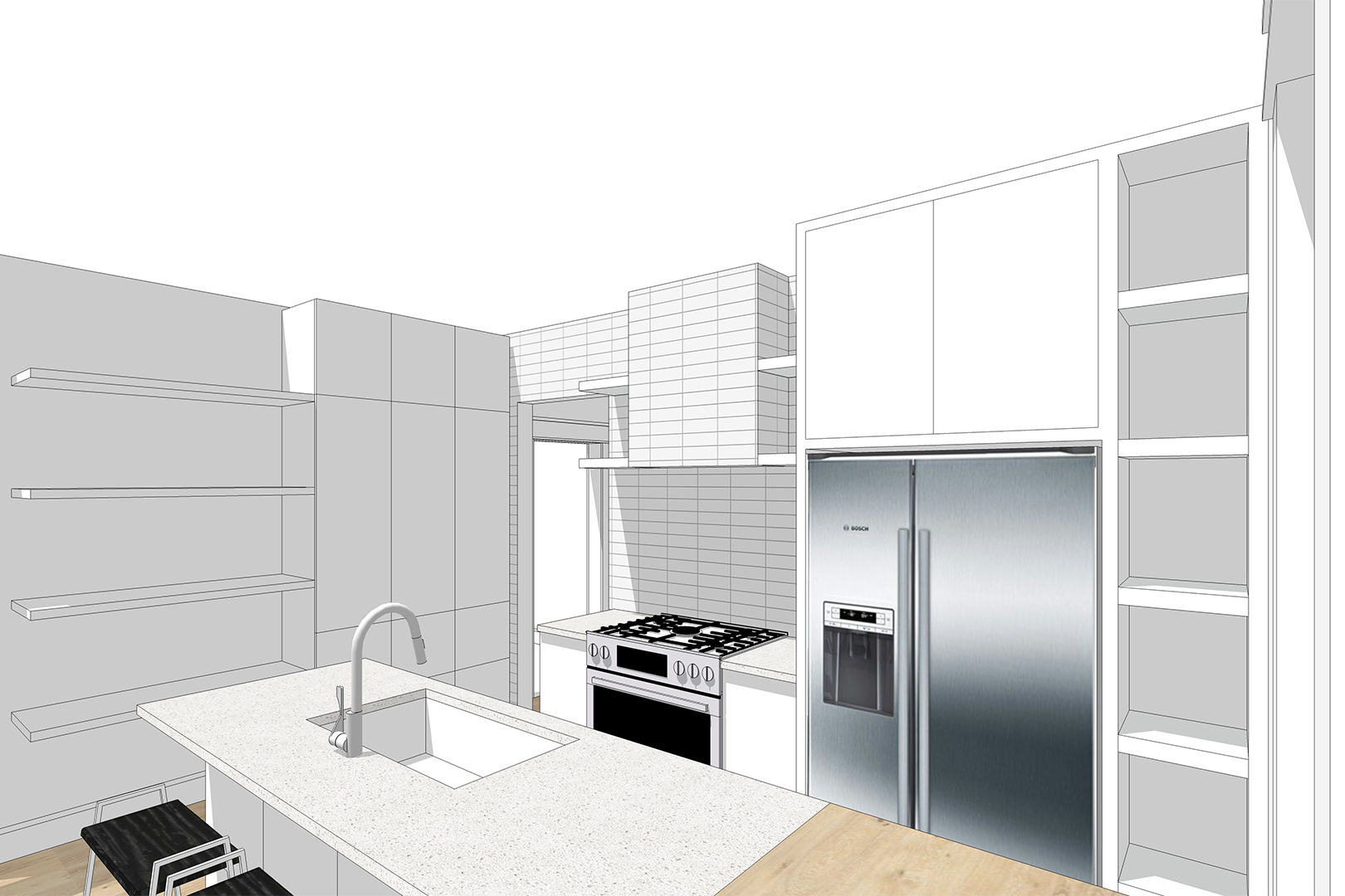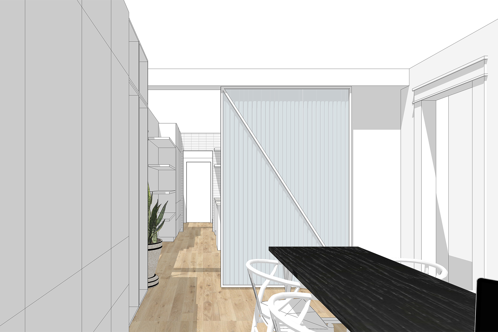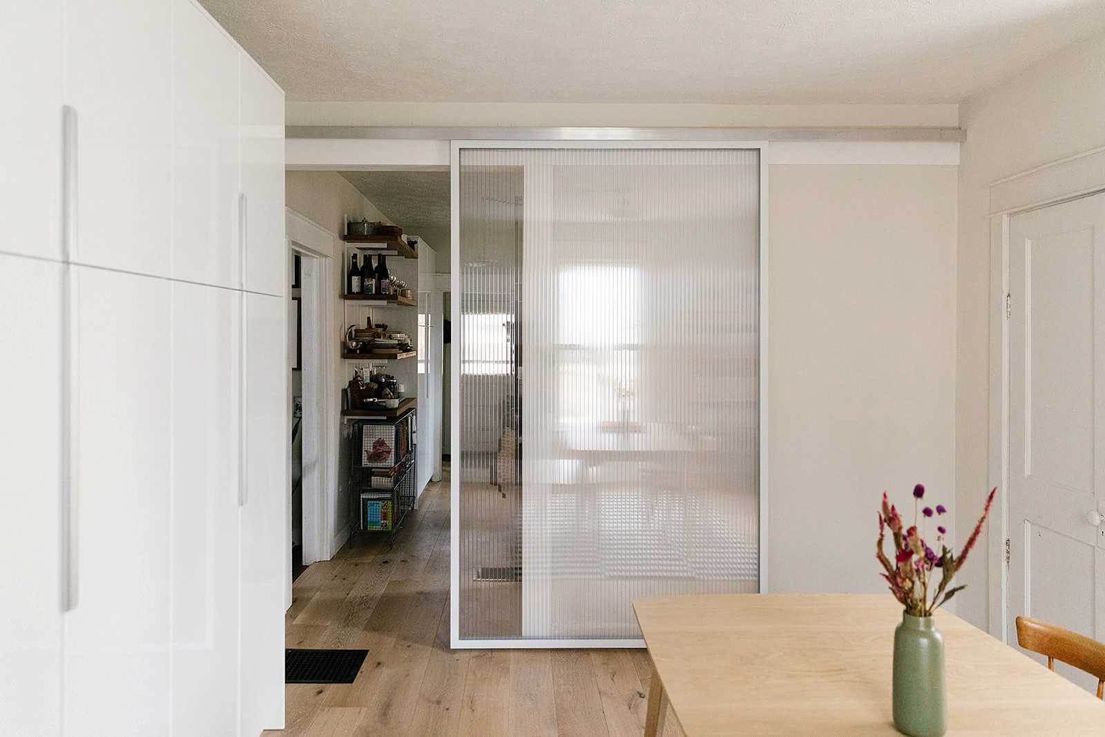 The only demolition that took place involved widening the doorframe to what was previously the guest bedroom (now the dining room). “It was a really hard pinch point,” recalls Sam. Heathfield tasked custom fabricator Central Scenic with creating a sliding door made from polycarbonate and powder-coated steel that, when Sam and Alex desired, could separate the area from the kitchen. When guests come to stay, the room acts as the ultimate flex space. “We opted for soft close, so it never slams,” adds Sam.