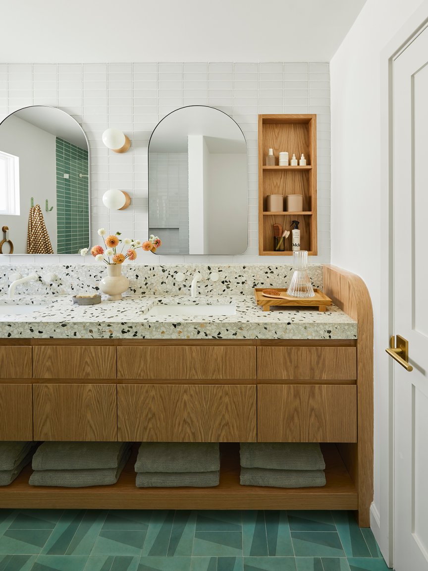 Boasting a total of eight functional drawers (the two wood panels underneath each sink are faux), each girl has a dedicated spot to stash heaps of hair tools and nail polish when the time comes. For everyday essentials like face wash and toothpaste, Dai carved out 3½-inch-deep oak shelves next to the AllModern mirrors. Her hope? This small addition will help the girls keep the terrazzo countertops clutter-free.