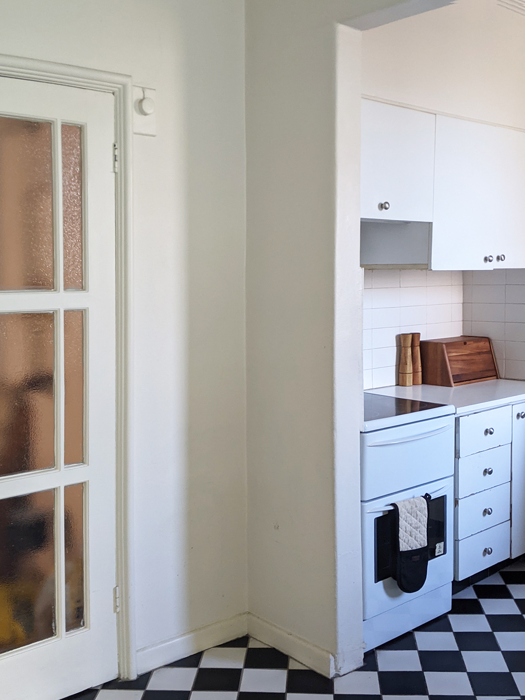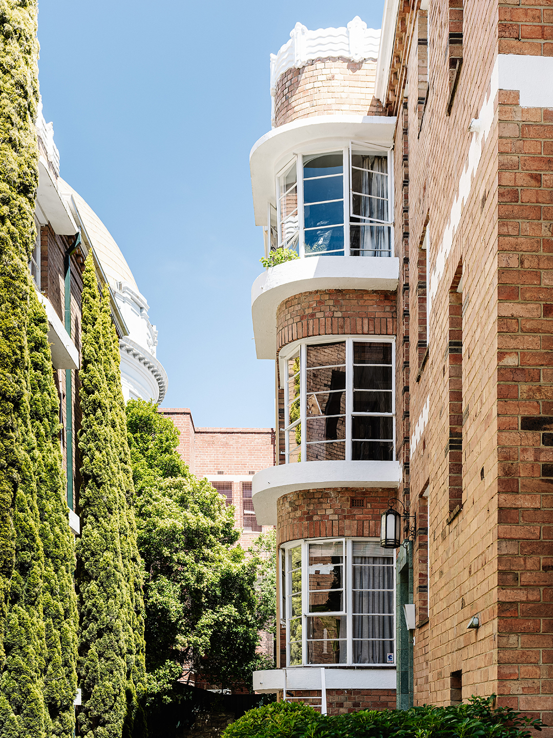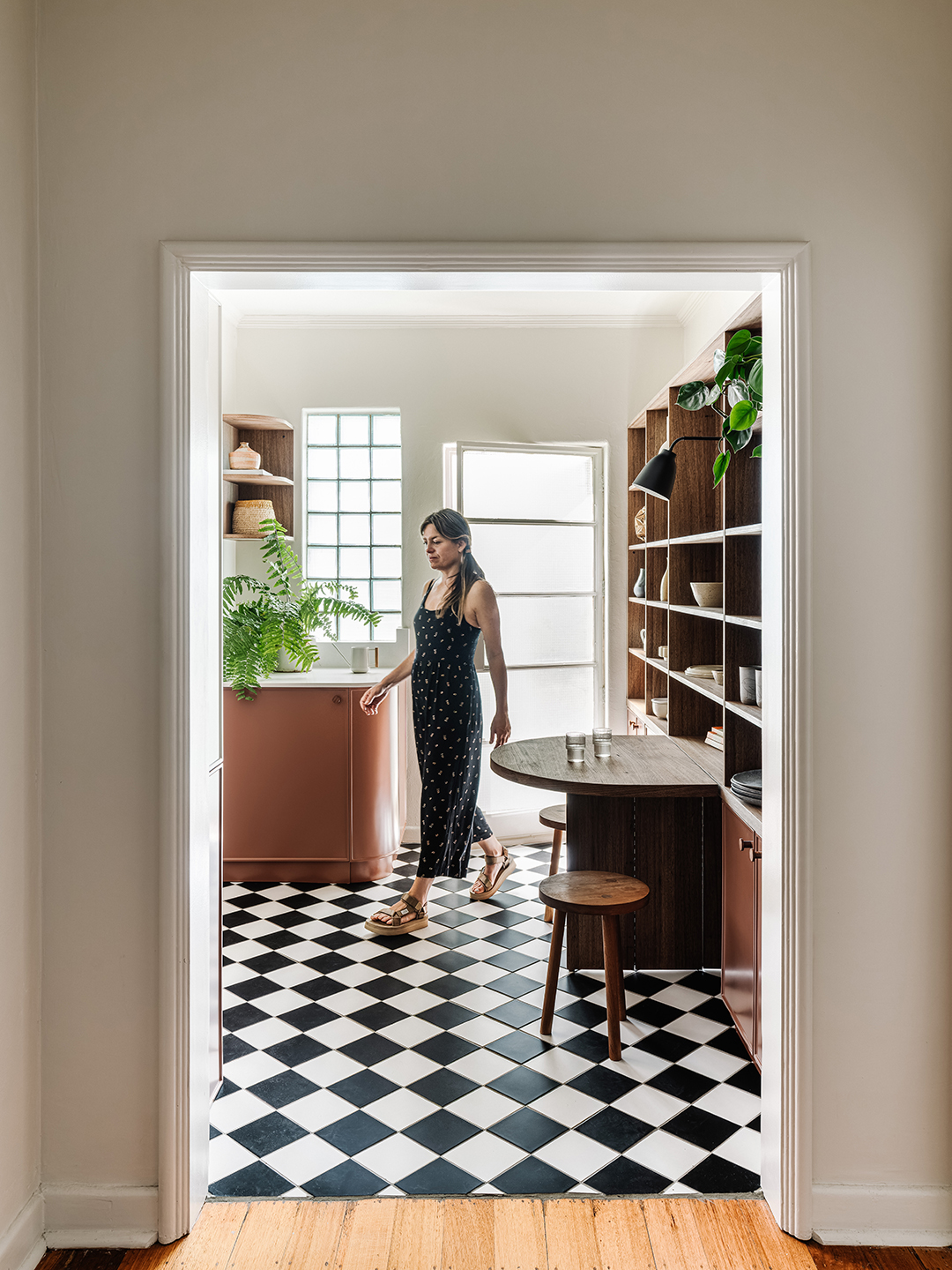 Brave New Eco is known for highly-saturated interiors, and for this project, they drew on the colors found in the architecture of the building. To complement the checkerboard tiles, which Norgate and her client determined they would keep, they looked to the architecture for color cues. Norgate explains, “We looked at the common areas, the stairwells’ beautiful tessellated tiles, lighting, the steelwork ornamentation, and the balustrades, and we pulled all our colors out from those areas.” Norgate paired a deep, muted maroon and a clotted cream off-white with a stained Australian hardwood for warmth.