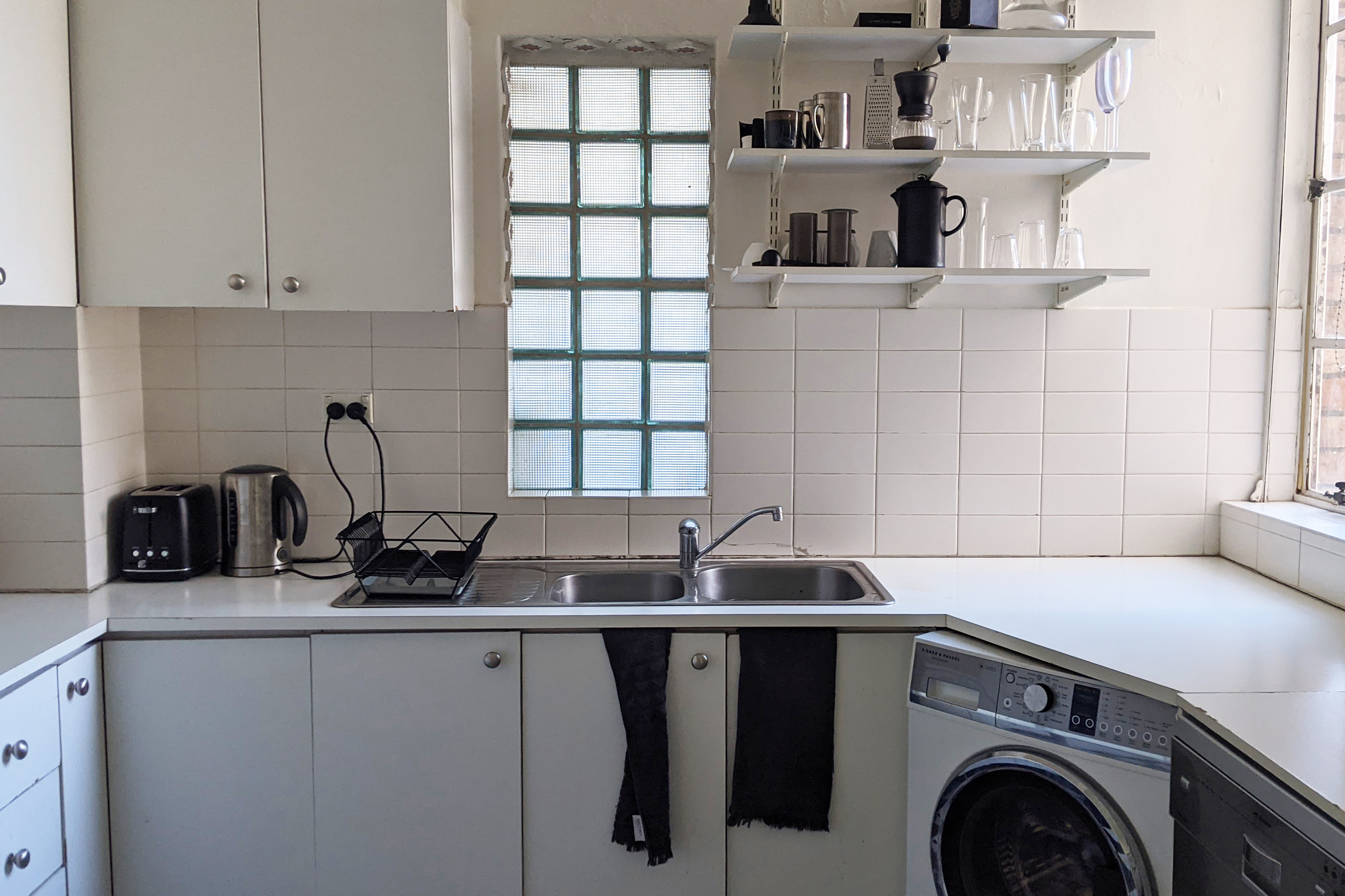 Norgate describes figuring out the appliance configuration for the small u-shaped cooking area to a game of Tetris, but she managed to fit in a cooktop, oven, sink, dishwasher, and refrigerator. Previously, the refrigerator blocked the window in the dining area, so she was determined to fit it into the main part of the kitchen. There was only one integrated model on the market (a Fisher and Paykel) that was narrow enough to fit the space.