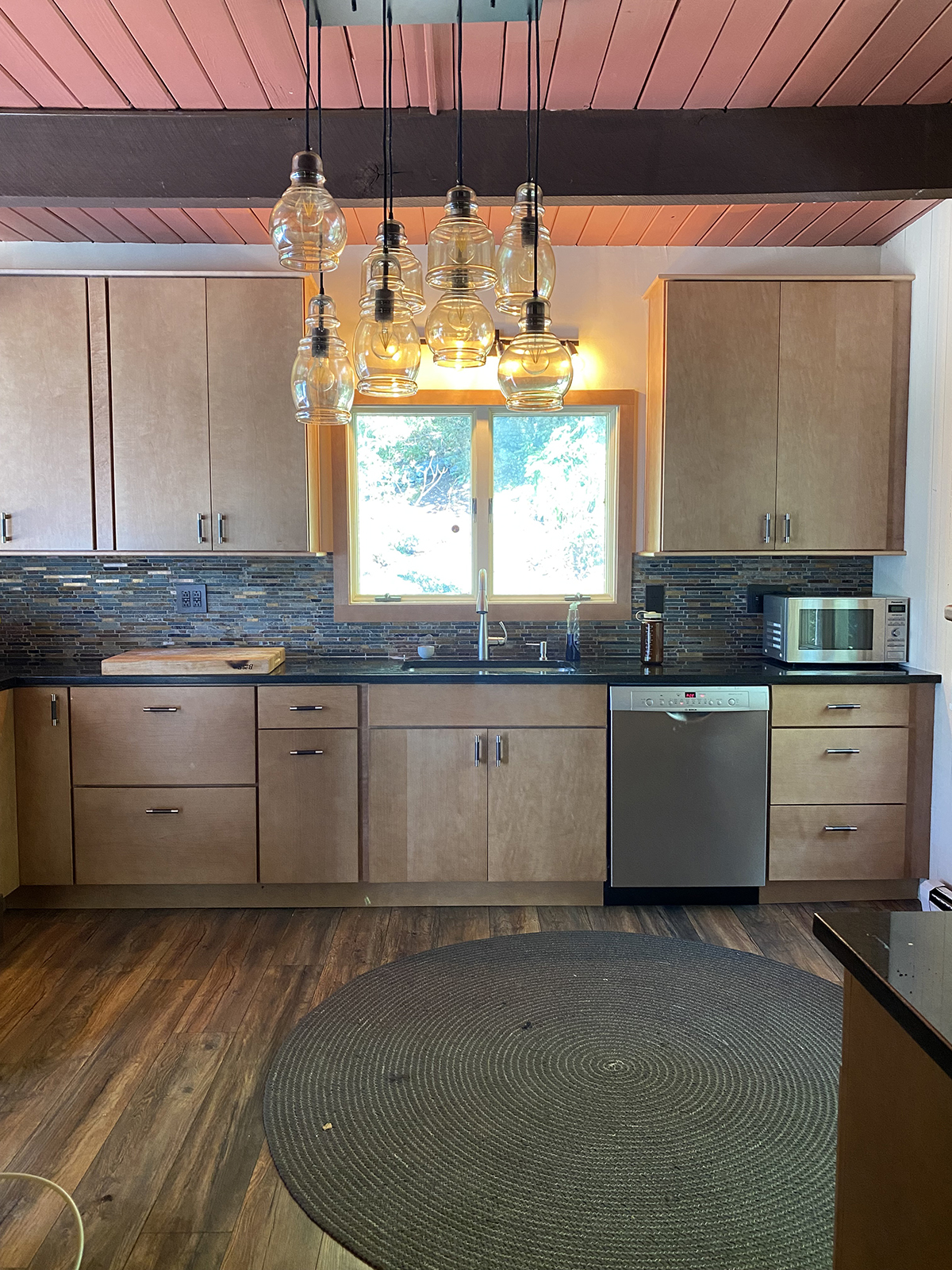 The kitchen wasn’t a full demo, and Spaulding knew she wanted to keep some of the upper and lower cabinets. To freshen them up, she gave them a minty-cool wash of Benjamin Moore’s Cucumber Salad. And while the corner cabinet may look old-fashioned, it’s a new build that’s sleeker than the clunky rectangular ones that were there before—plus now it’s a pretty place to display booze.