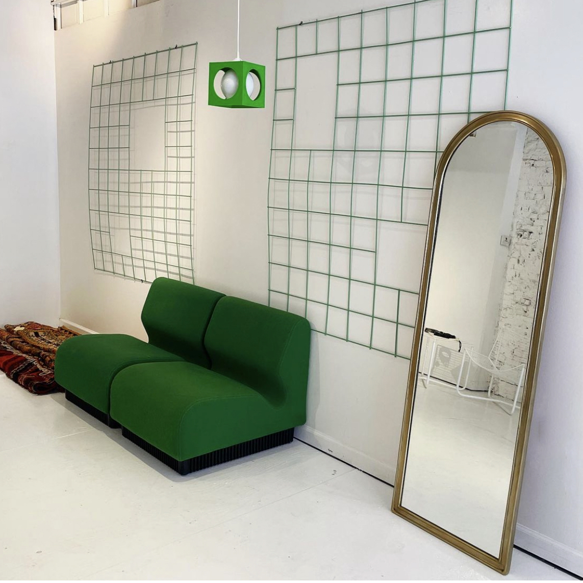 The curation of preloved home and fashion goodies from the 19th century to the space age draw you in the old glass-paned doors. In the front room, a rattan floor lamp is nestled next to a Bauhaus chrome tubular leather daybed. Alongside another wall sit cherry red Henry Massonnet cocktail tables that host vases from the 1960s. And just like a home, Gray knew that with a few low-budget projects she could amp up the wow factor ever further.