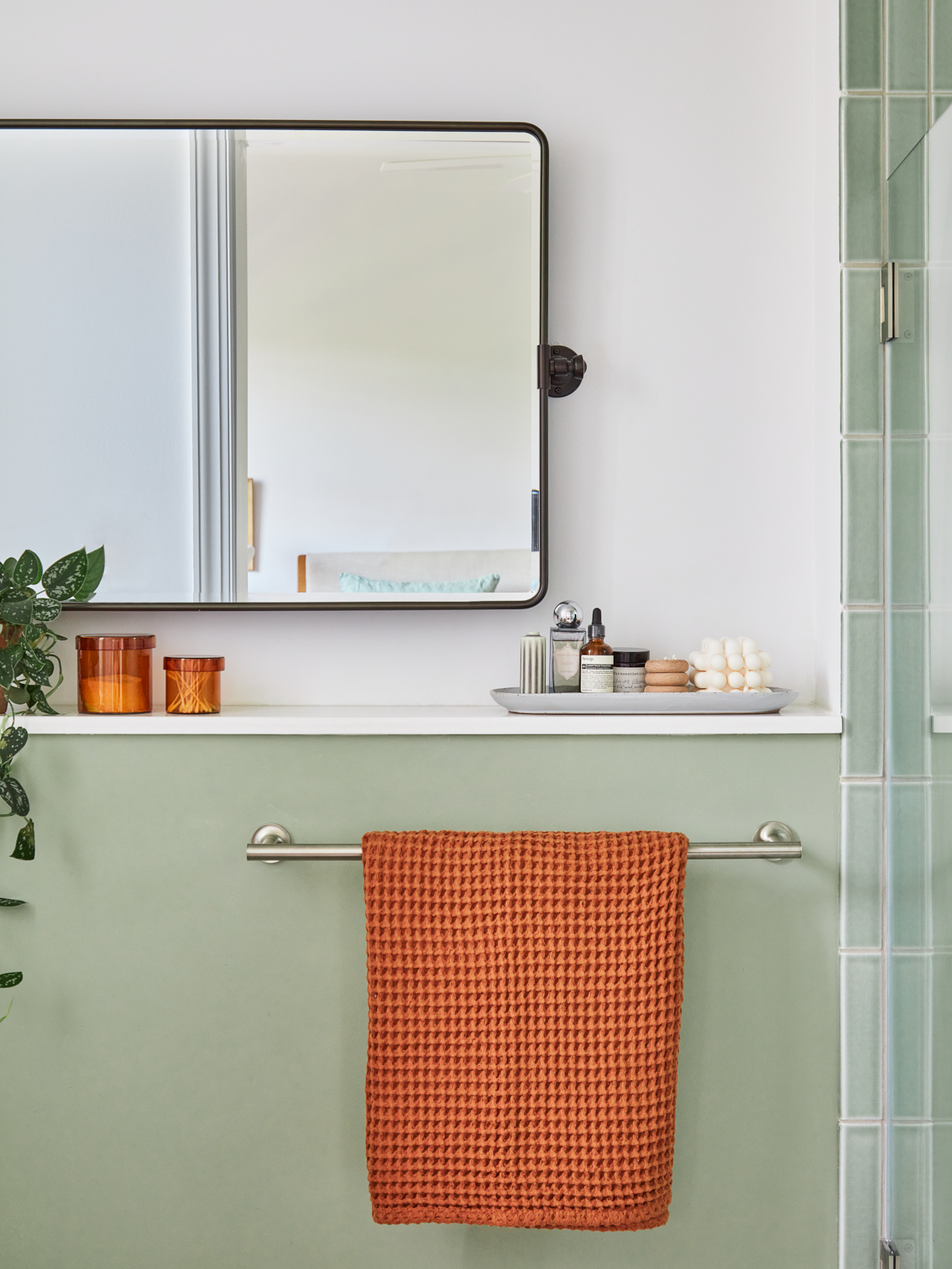 The lingering challenge was: Where to put the mirror. (The windowsill in front of the sink prevented us from placing one there.) Fortunately, there is an expansive wall to the left of the shower. At first, I considered a medicine cabinet, but the truth is we didn’t need the storage space, so I bought a simple $300 pivot mirror. We have plenty of room in our new vanity for most of our things, but this small ledge is perfect for displaying cotton swabs, candles, and everyday skin care.