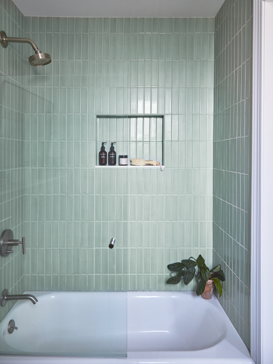 As I peered into the bathroom from our bedroom, I noticed it still needed just a little something—it was too blank. I painted the wall closest to the toilet Weekend Getaway by Benjamin Moore, which corresponds nicely with the Rosemary tile. To protect the fresh paint from any water damage from the shower, we opted for the brand’s Aura Bath & Spa finish.